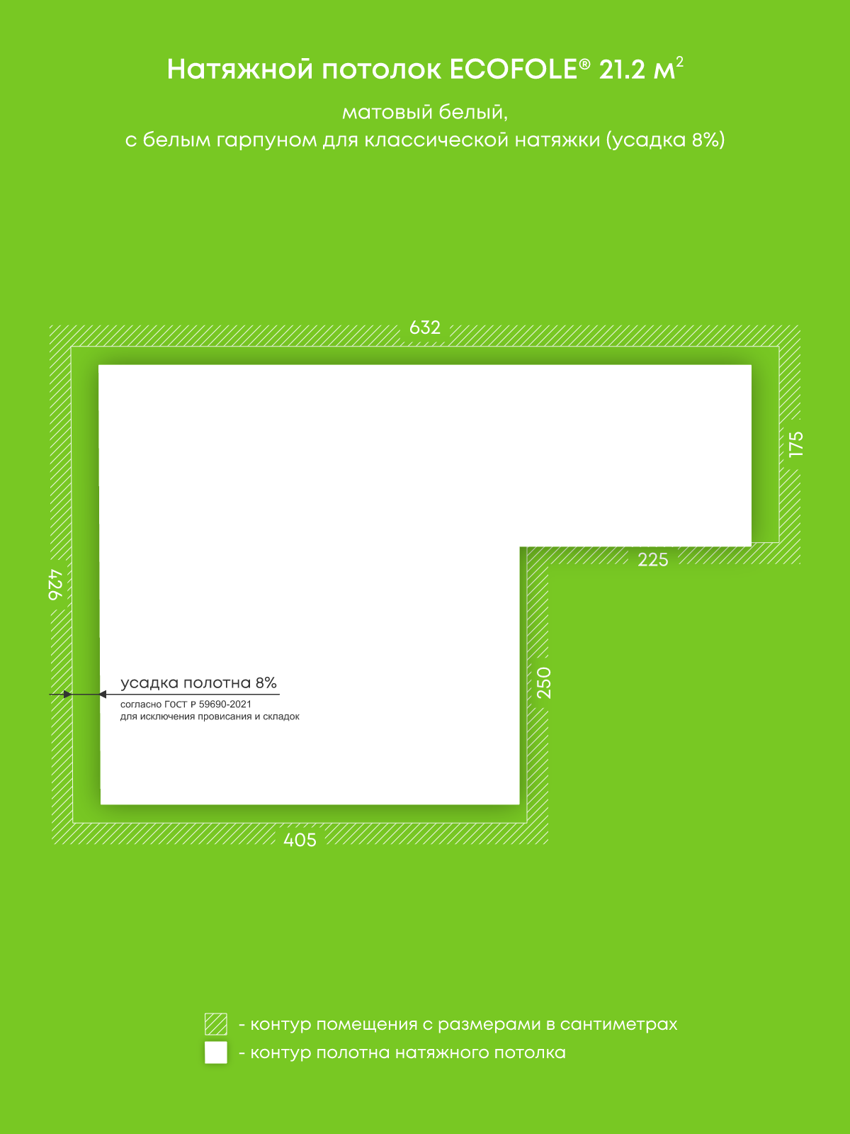 Натяжной потолок белый матовый, изготовленный по индивидуальным размерам покупателя, для гостиной площадью 21.2 м2