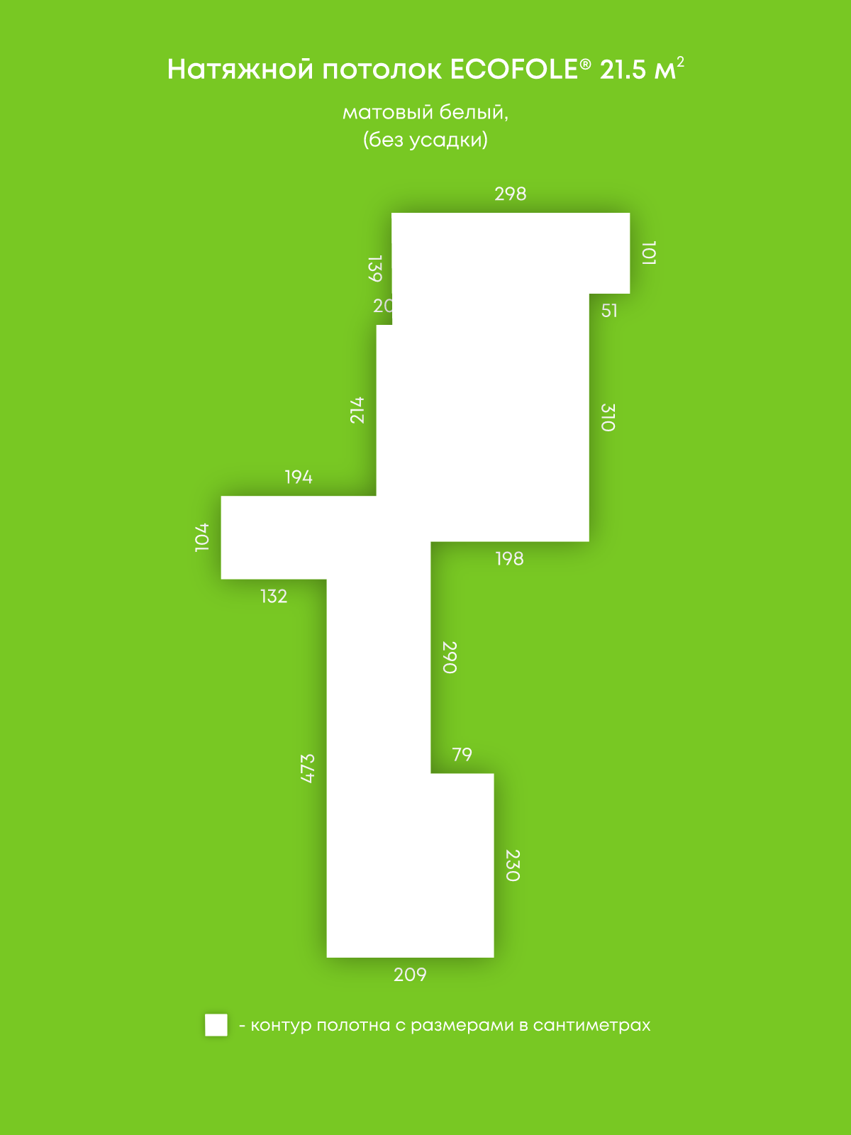 Натяжной потолок белый матовый, изготовленный по индивидуальным размерам покупателя, для помещения площадью 21.5 м2
