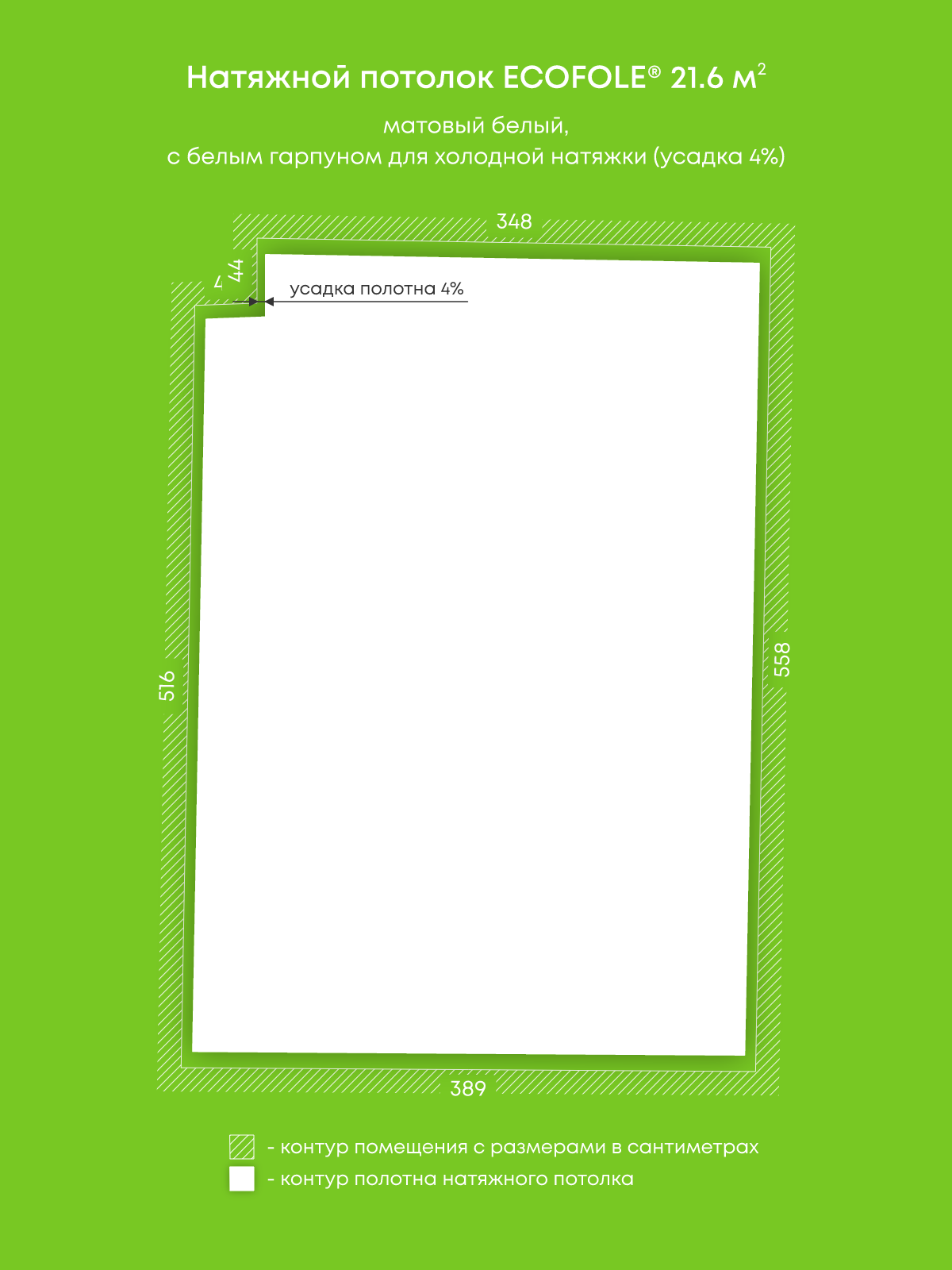Натяжной потолок белый матовый, изготовленный по индивидуальным размерам покупателя, для спальни площадью 21.6 м2