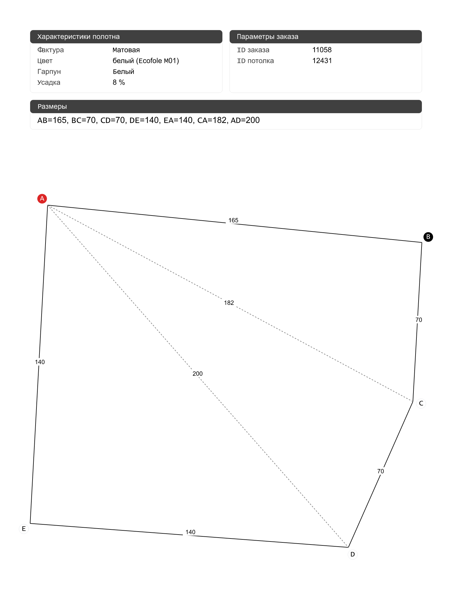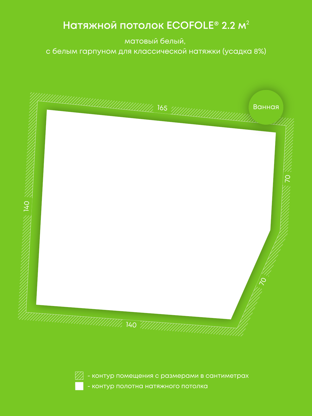 Натяжной потолок белый матовый, классической натяжки, изготовленный по индивидуальным размерам покупателя, для помещения площадью 2.2 м2