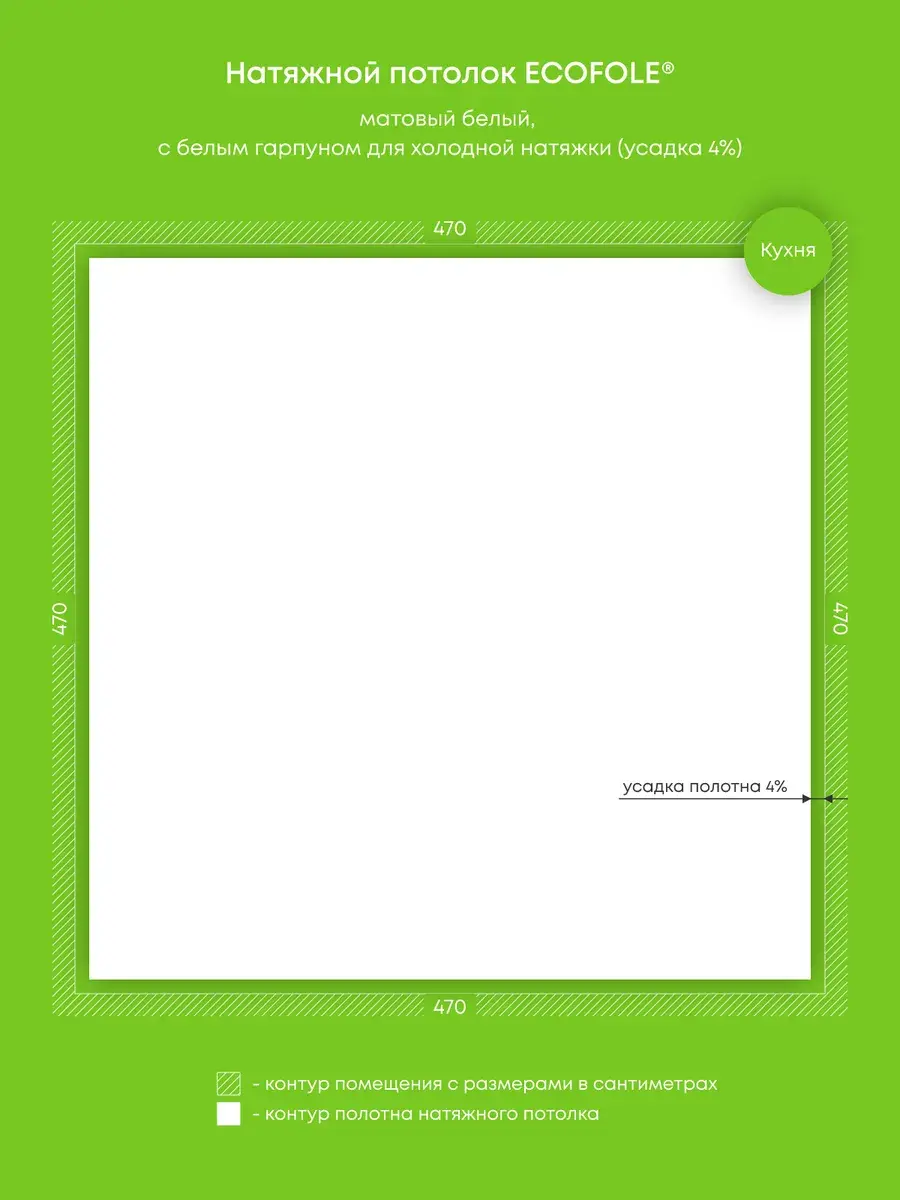 - Технология производства натяжного потолка предусматривает его усадку на 4-9% для исключения провисания после монтажа, т.е. фактический размер готового потолка составляет на 4-9% меньше исходного размера помещения и не является браком;