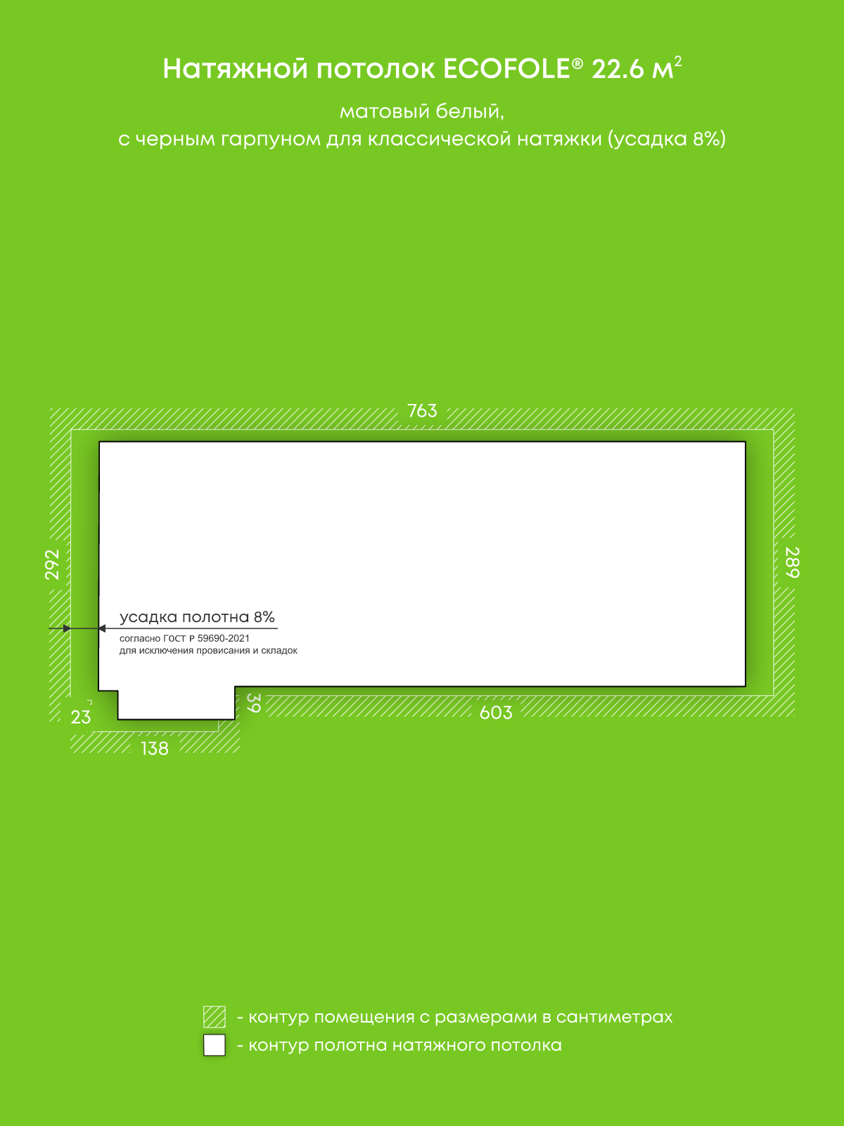 Натяжной потолок белый матовый, изготовленный по индивидуальным размерам покупателя, для гостиной площадью 22.6 м2