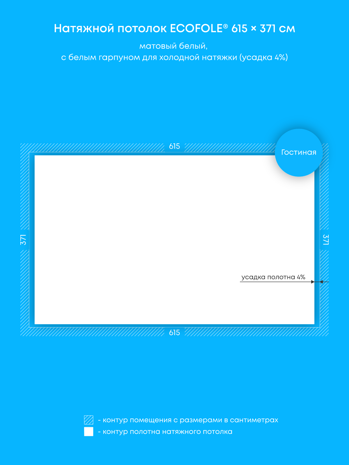 Натяжной потолок белый матовый, холодной натяжки, изготовленный по индивидуальным размерам покупателя, для помещения площадью 22.8 м2