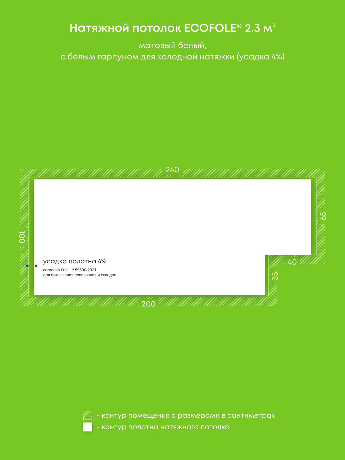 Натяжной потолок белый матовый, изготовленный по индивидуальным размерам покупателя, для помещения площадью 2.3 м2