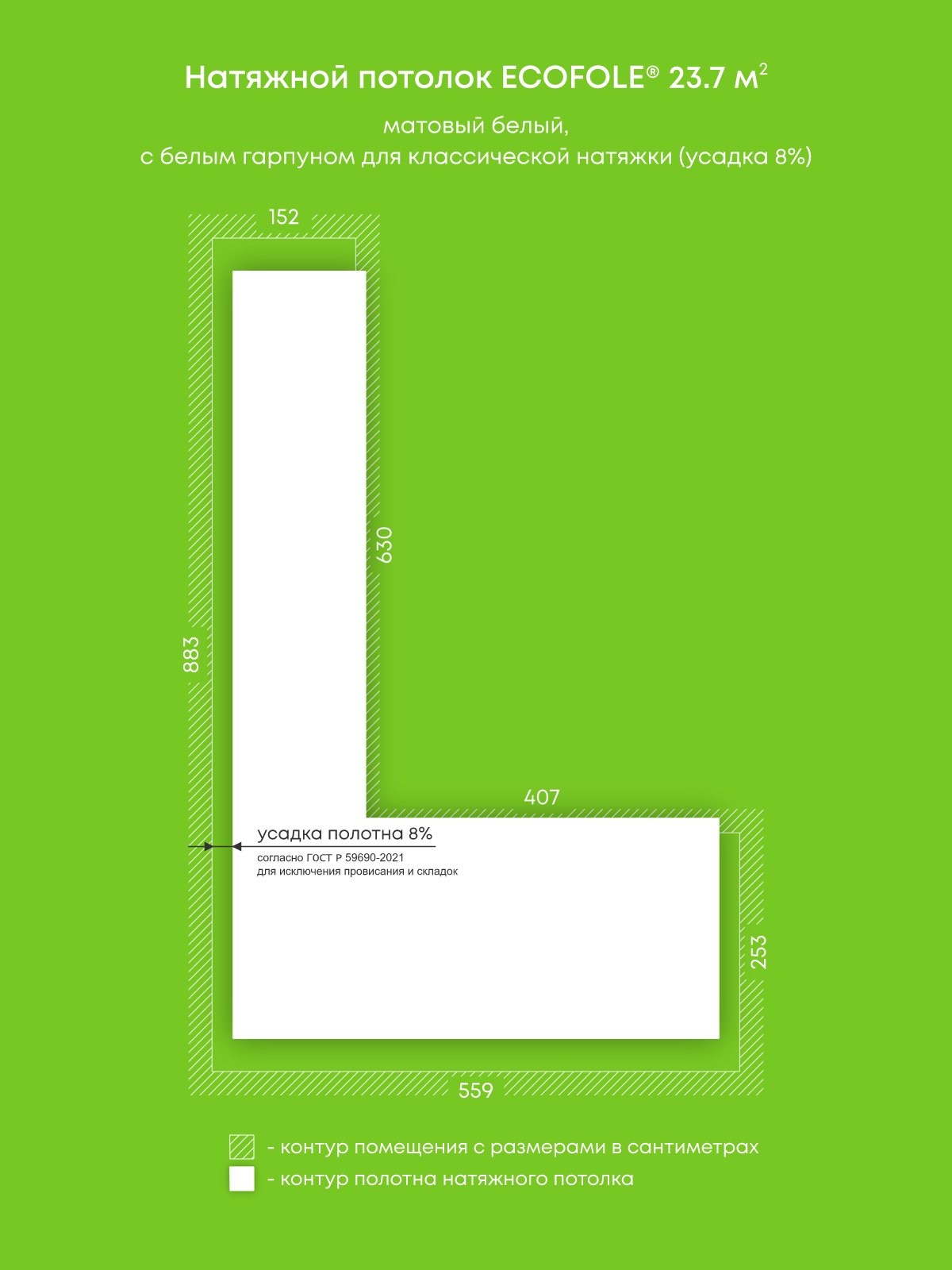 Натяжной потолок белый матовый, изготовленный по индивидуальным размерам покупателя, для помещения площадью 23.7 м2