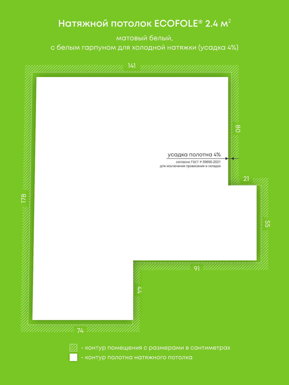 Натяжной потолок белый матовый, изготовленный по индивидуальным размерам покупателя, для гостиной площадью 2.4 м2