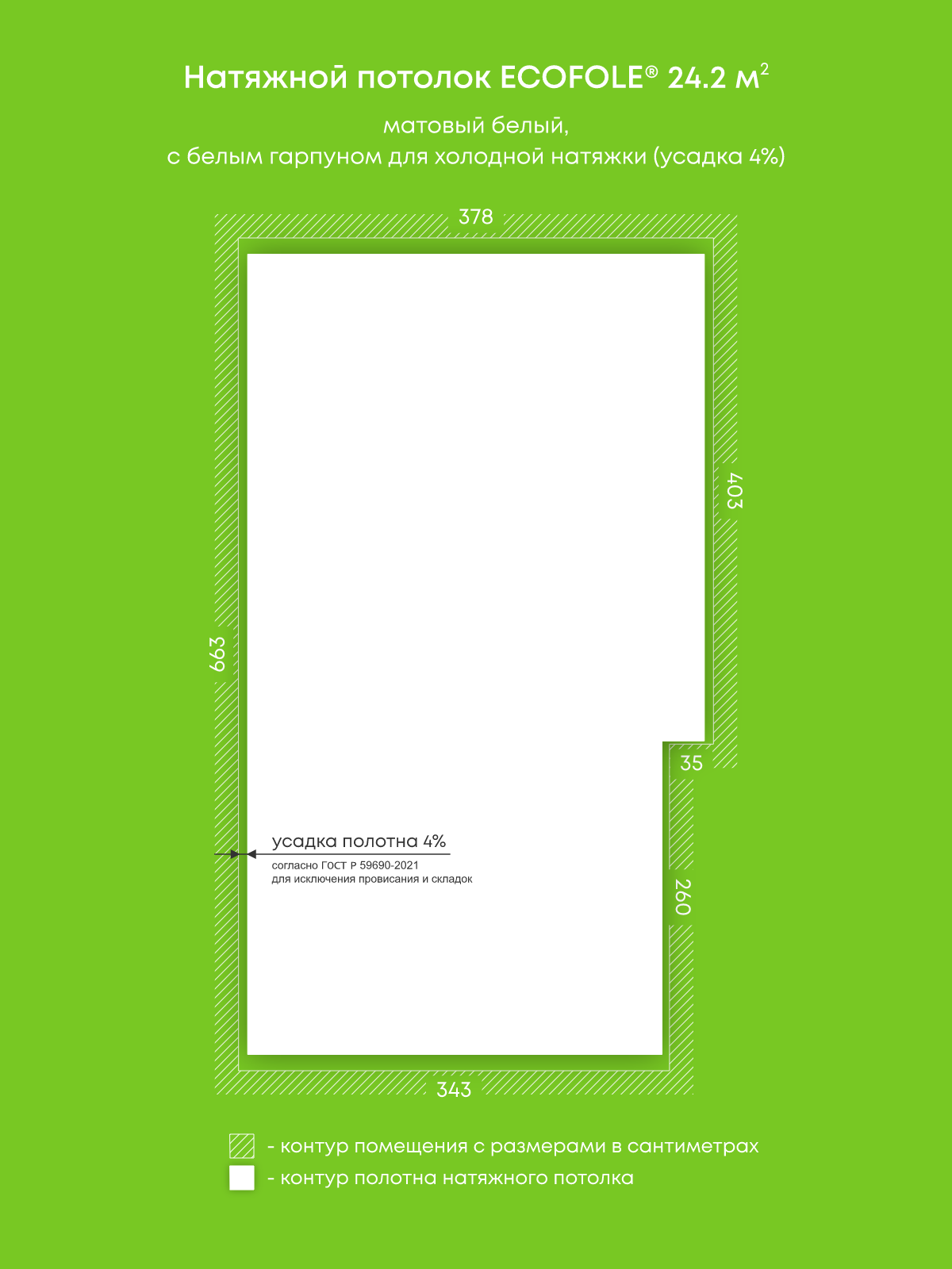 Натяжной потолок белый матовый, изготовленный по индивидуальным размерам покупателя, для помещения площадью 24.2 м2