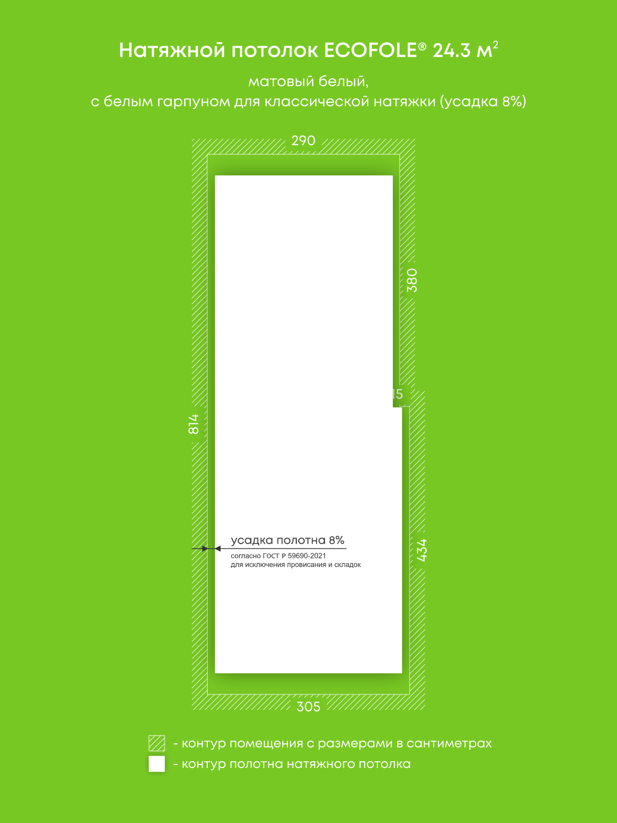 Натяжной потолок белый матовый, изготовленный по индивидуальным размерам покупателя, для гостиной площадью 24.3 м2
