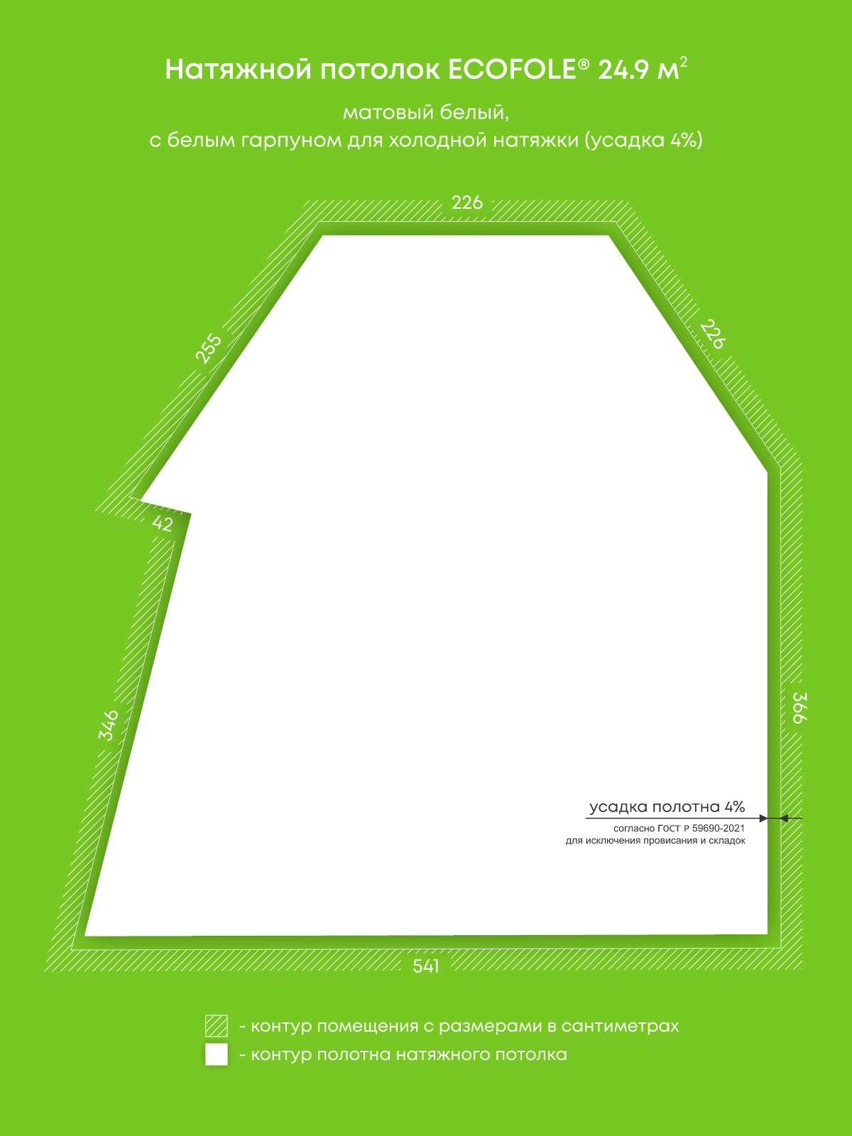 Натяжной потолок белый матовый, изготовленный по индивидуальным размерам покупателя, для комнаты площадью 24.9 м2