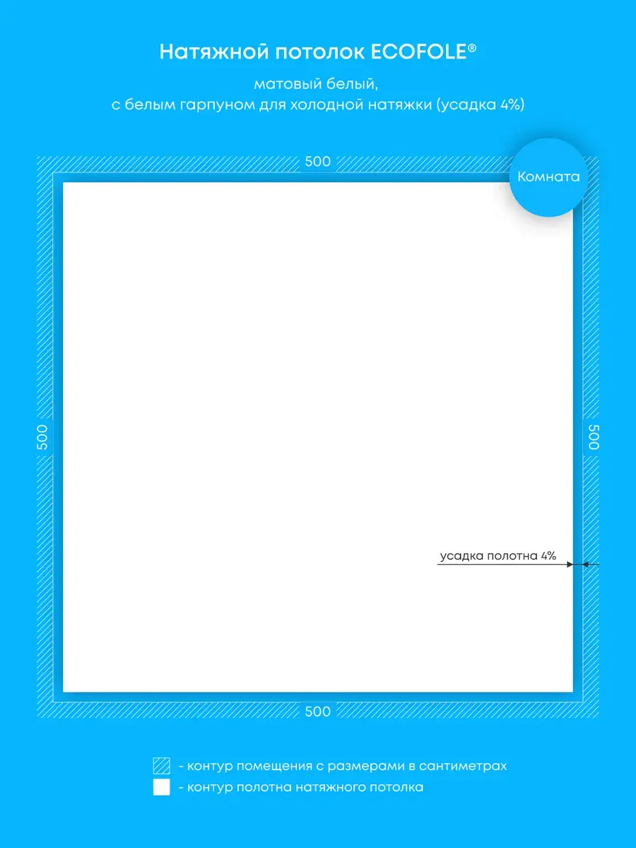 - Технология производства натяжного потолка предусматривает его усадку на 4-9% для исключения провисания после монтажа, т.е. фактический размер готового потолка составляет на 4-9% меньше исходного размера помещения и не является браком;