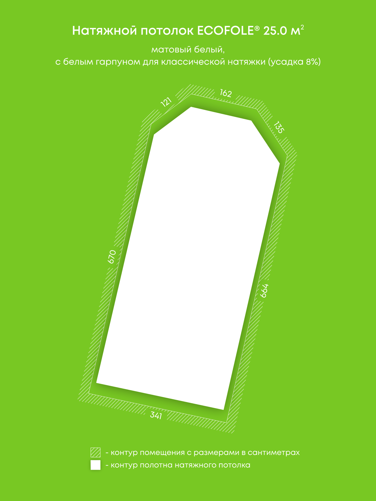 Натяжной потолок белый матовый, изготовленный по индивидуальным размерам покупателя, для помещения площадью 25 м2