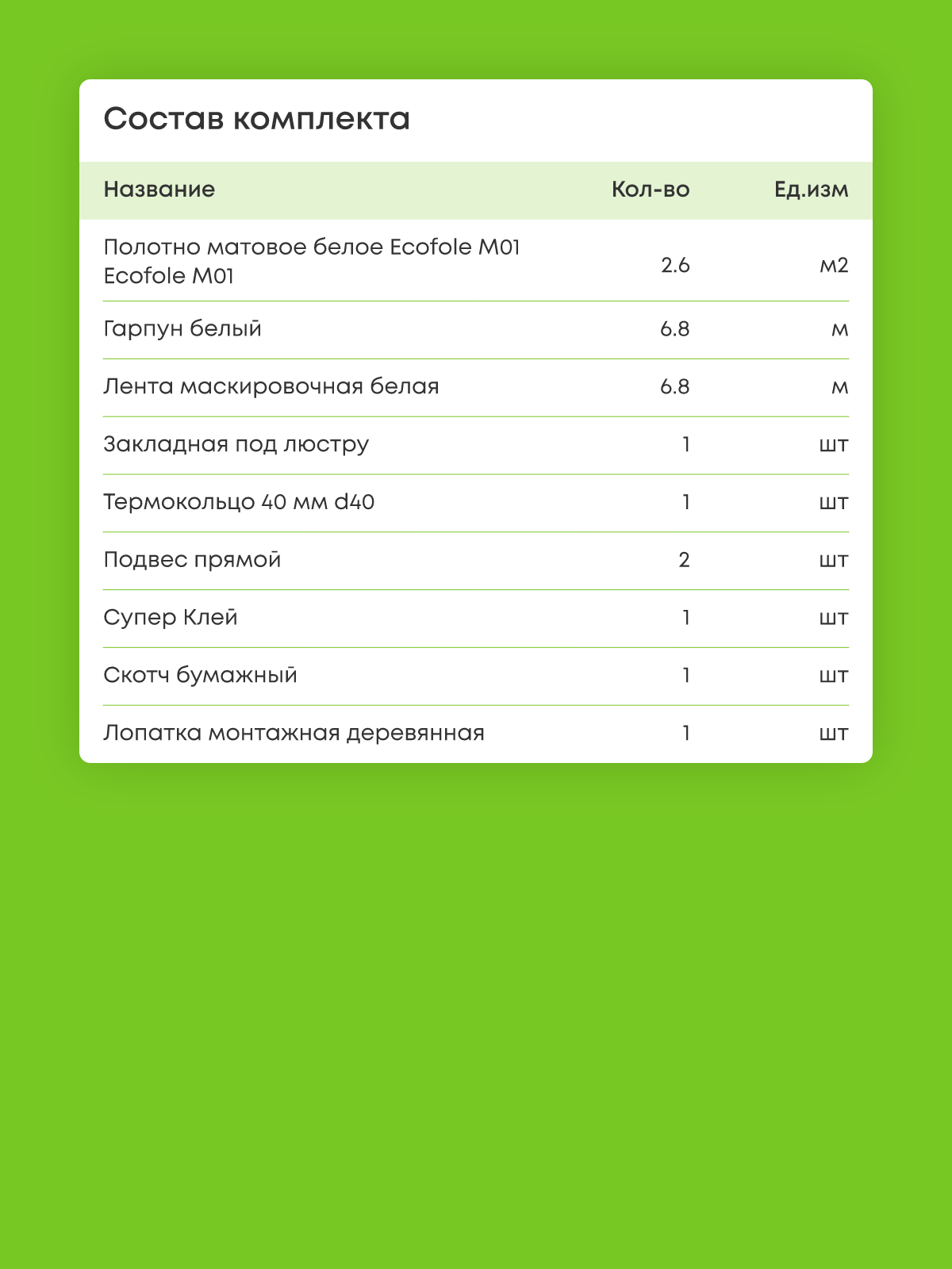 Натяжной потолок белый матовый, изготовленный по индивидуальным размерам покупателя, для помещения площадью 2.6 м2