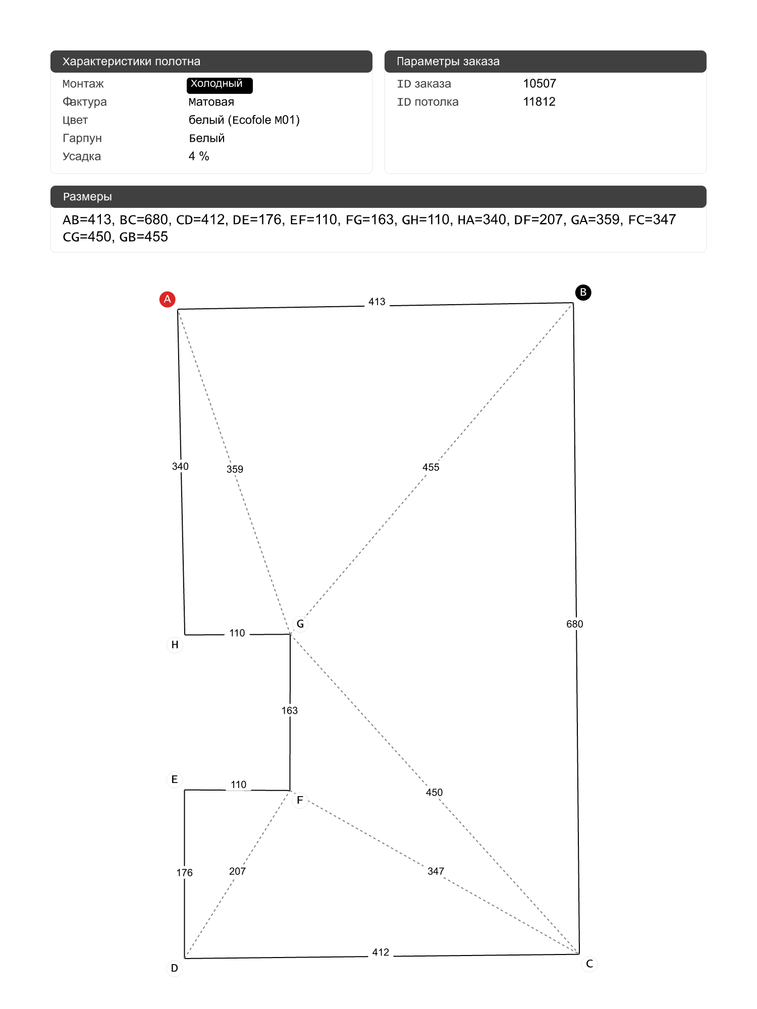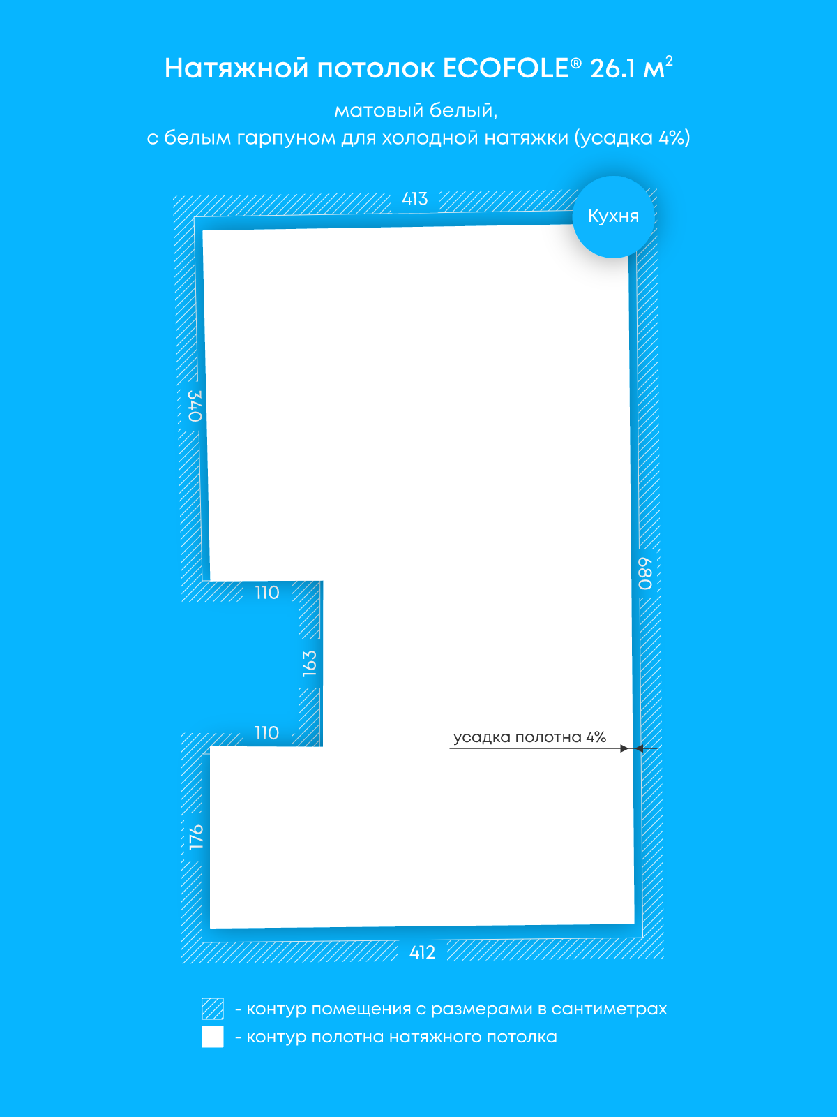 Натяжной потолок белый матовый, холодной натяжки, изготовленный по индивидуальным размерам покупателя, для помещения площадью 26.1 м2