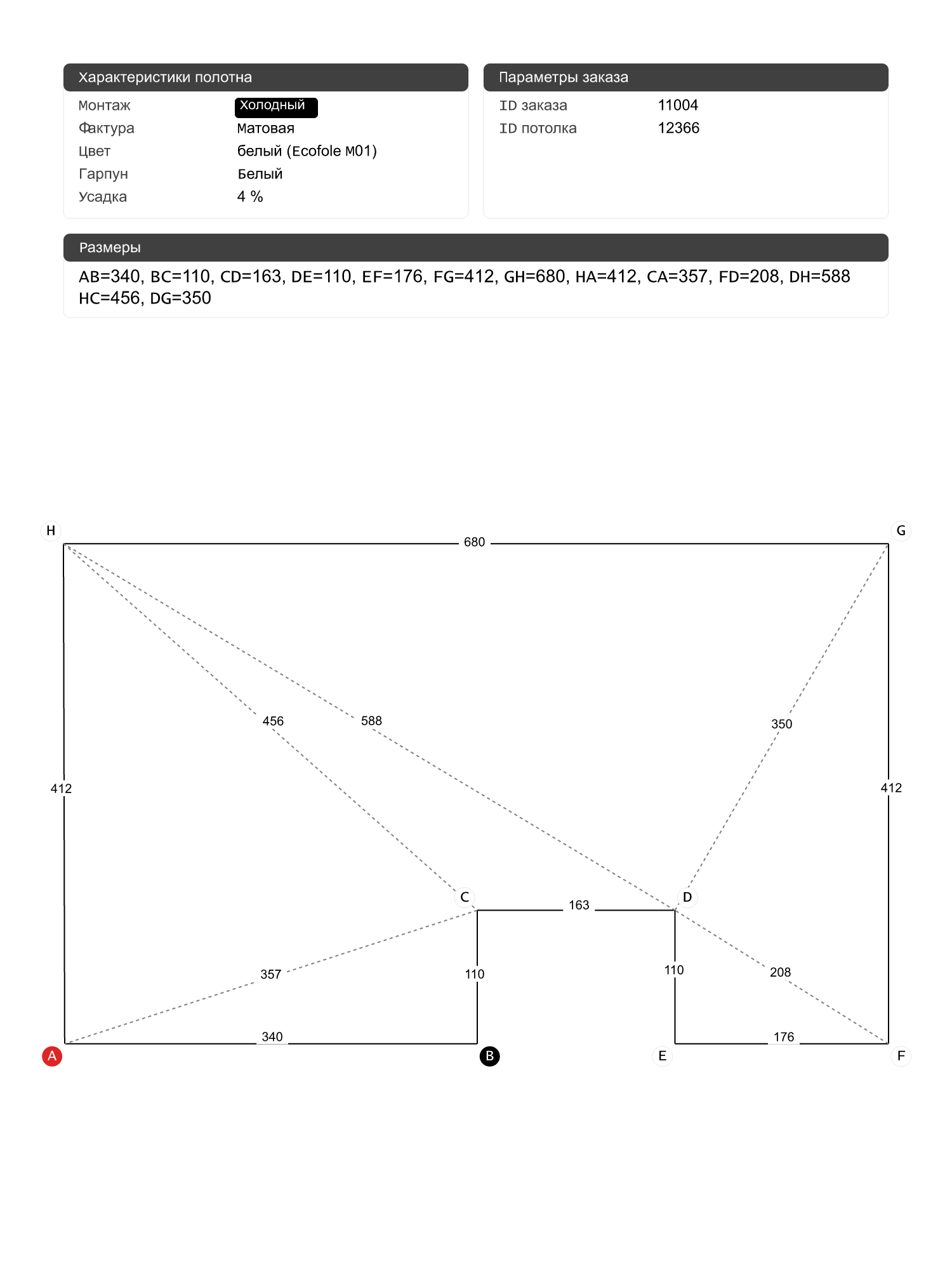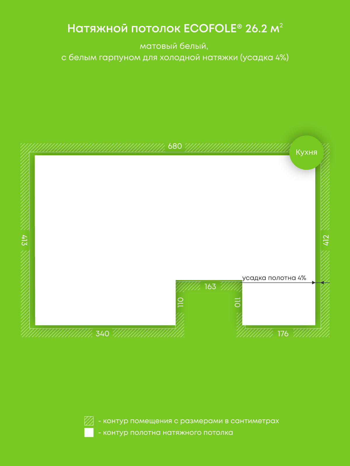 Натяжной потолок белый матовый, холодной натяжки, изготовленный по индивидуальным размерам покупателя, для помещения площадью 26.2 м2