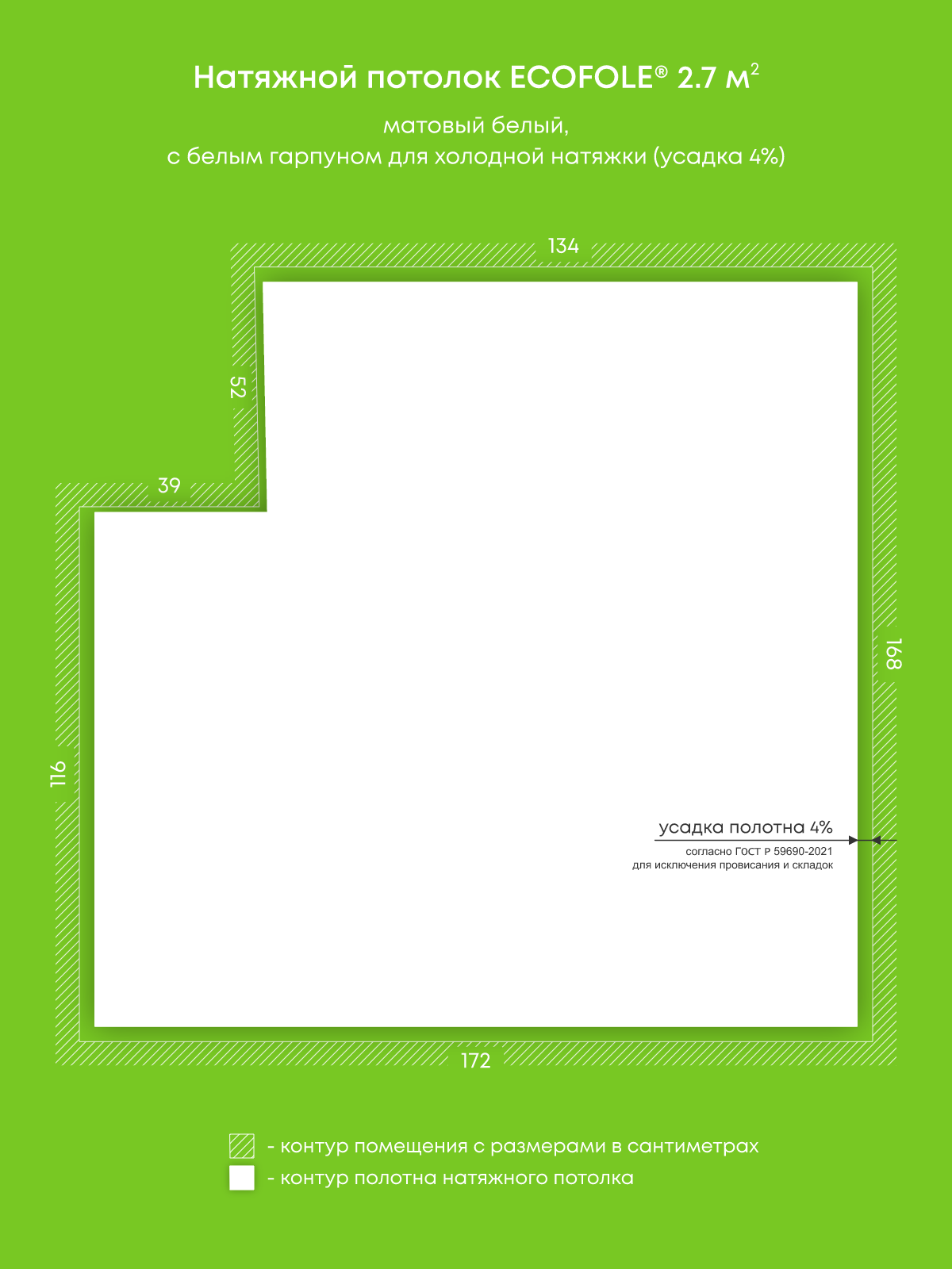 Натяжной потолок белый матовый, изготовленный по индивидуальным размерам покупателя, для ванной площадью 2.7 м2