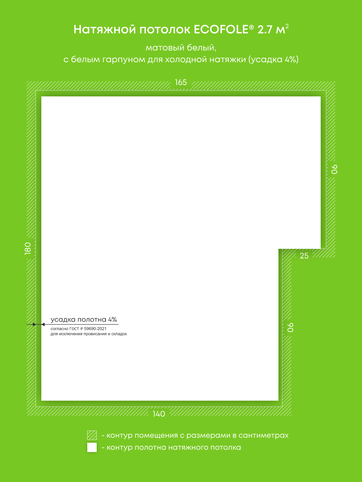 Натяжной потолок белый матовый, изготовленный по индивидуальным размерам покупателя, для ванной площадью 2.7 м2