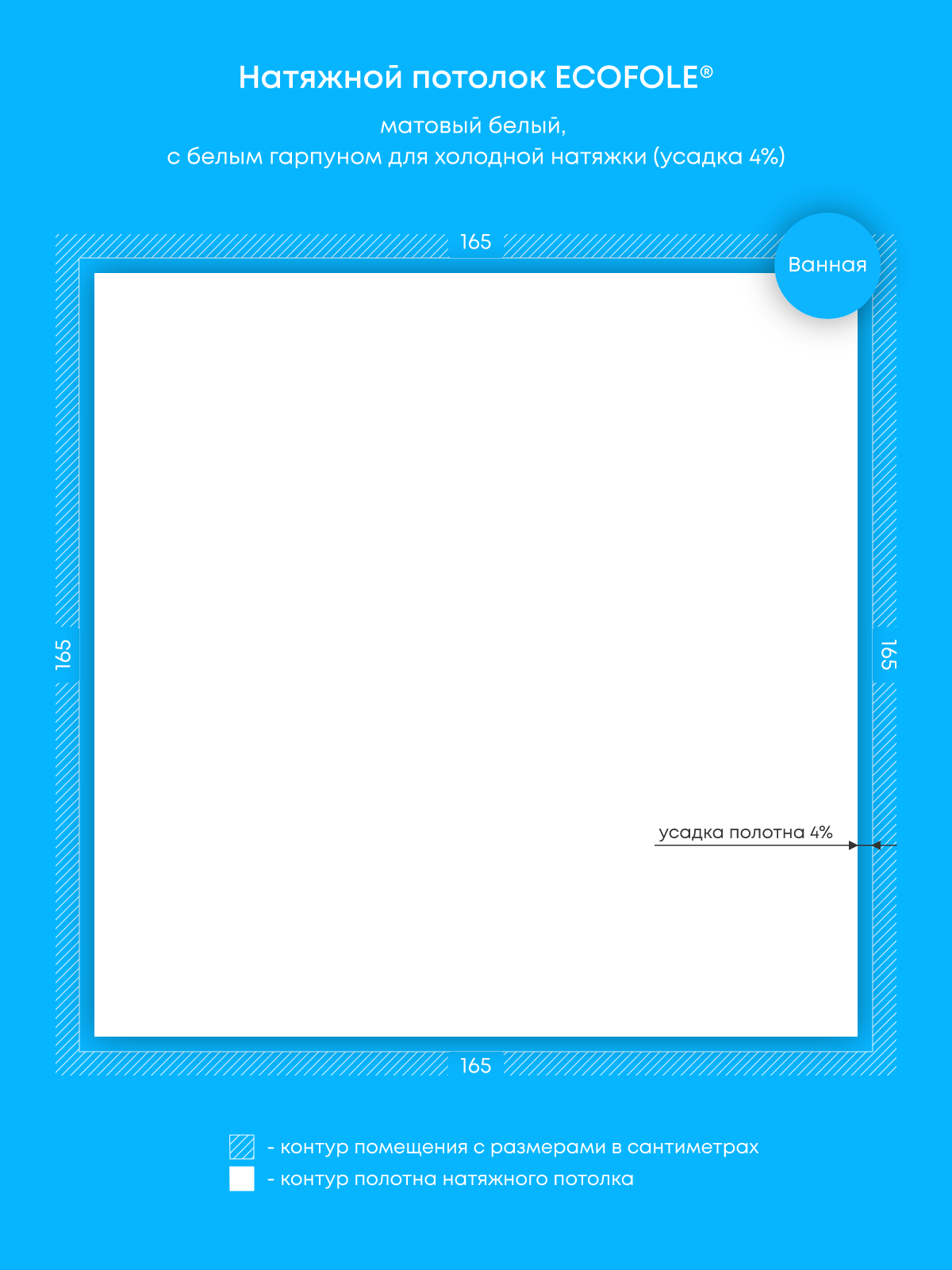 Натяжной потолок белый матовый, холодной натяжки, изготовленный по индивидуальным размерам покупателя, для помещения площадью 2.7 м2