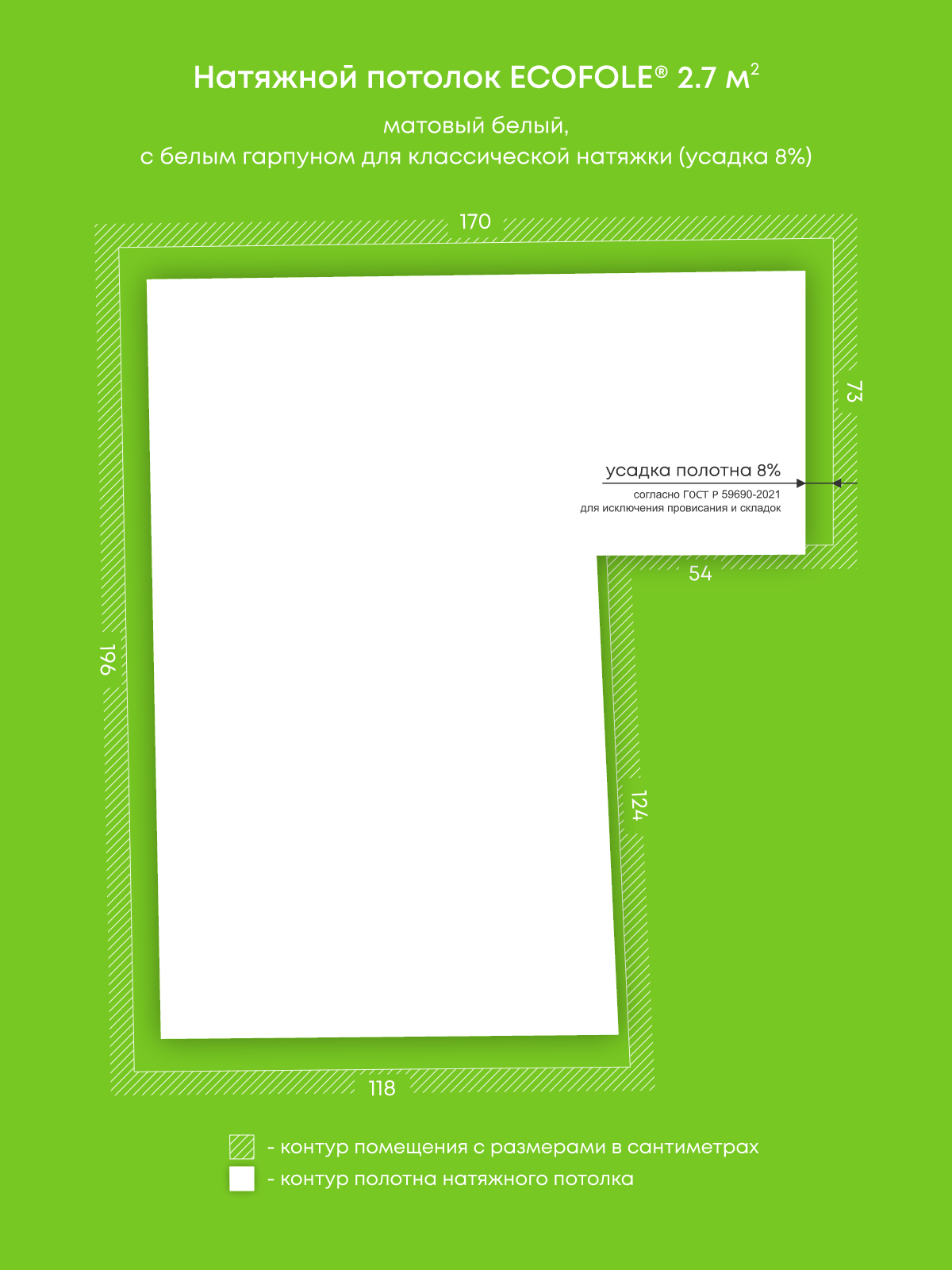 Натяжной потолок белый матовый, изготовленный по индивидуальным размерам покупателя, для помещения площадью 2.7 м2