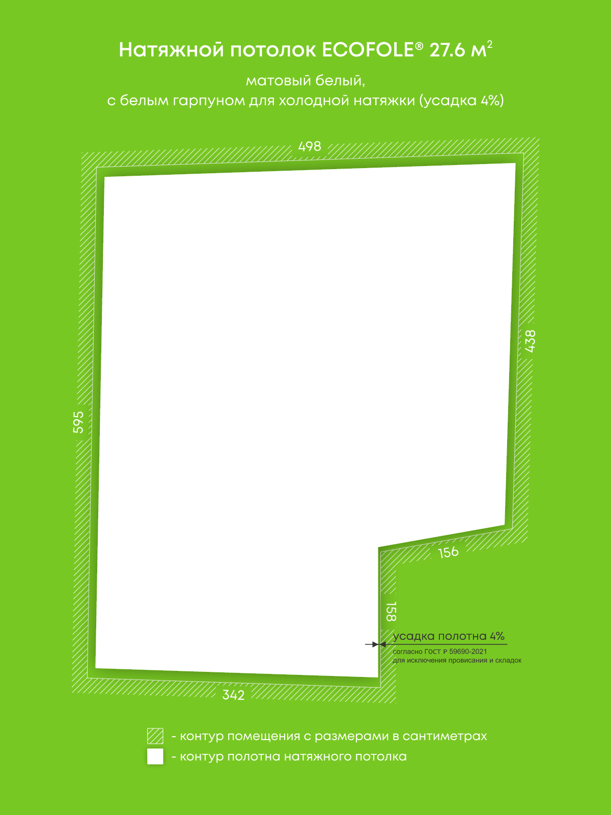 Натяжной потолок белый матовый, изготовленный по индивидуальным размерам покупателя, для спальни площадью 27.6 м2