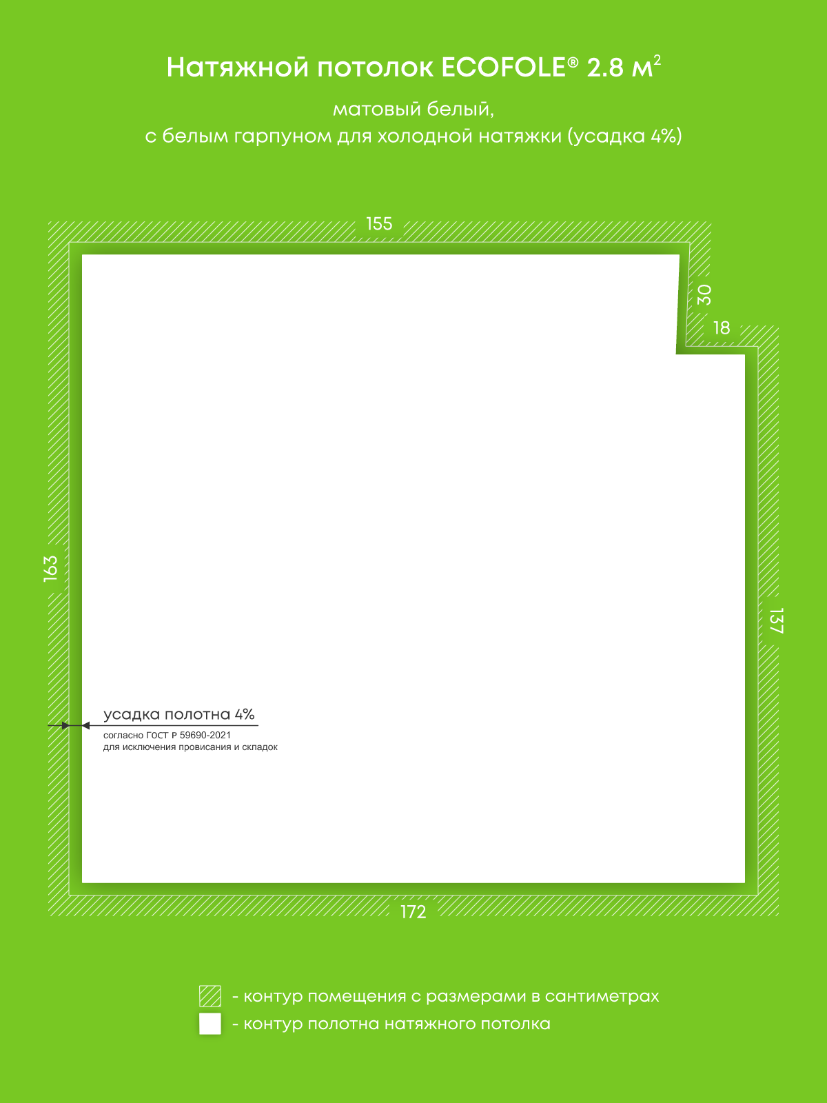 Натяжной потолок белый матовый, изготовленный по индивидуальным размерам покупателя, для помещения площадью 2.8 м2