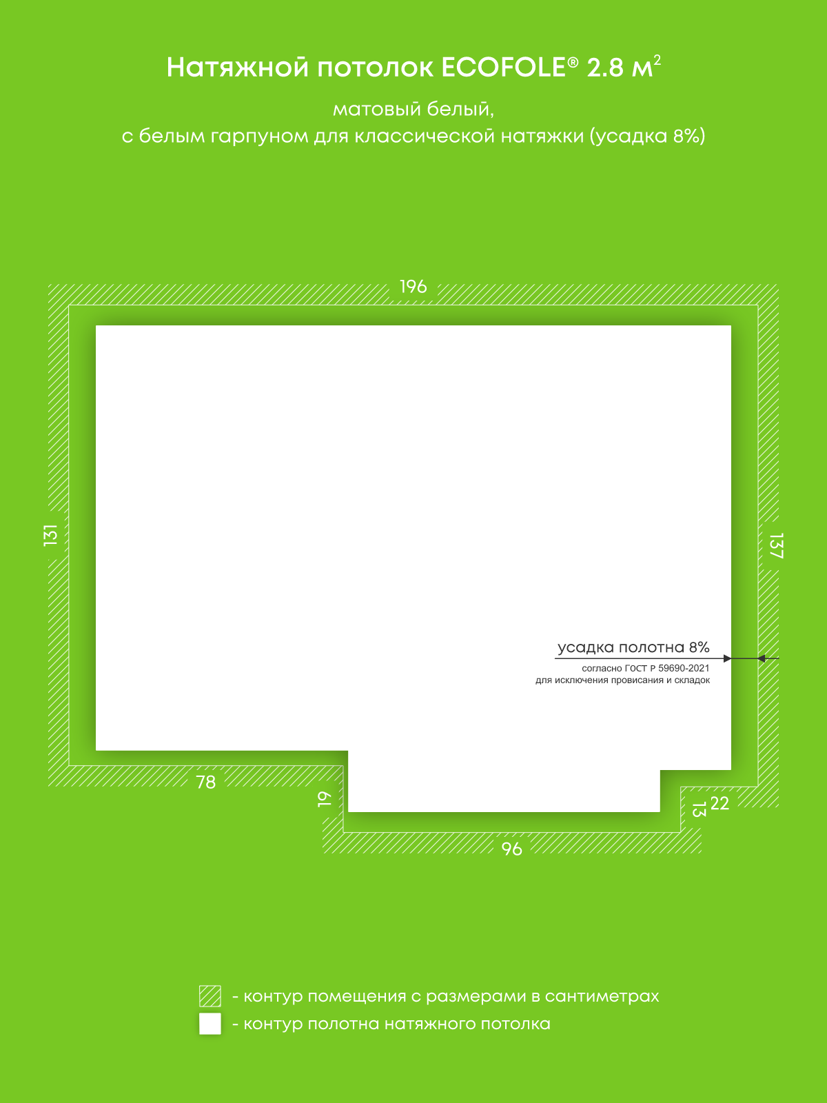 Натяжной потолок белый матовый, изготовленный по индивидуальным размерам покупателя, для ванной площадью 2.8 м2