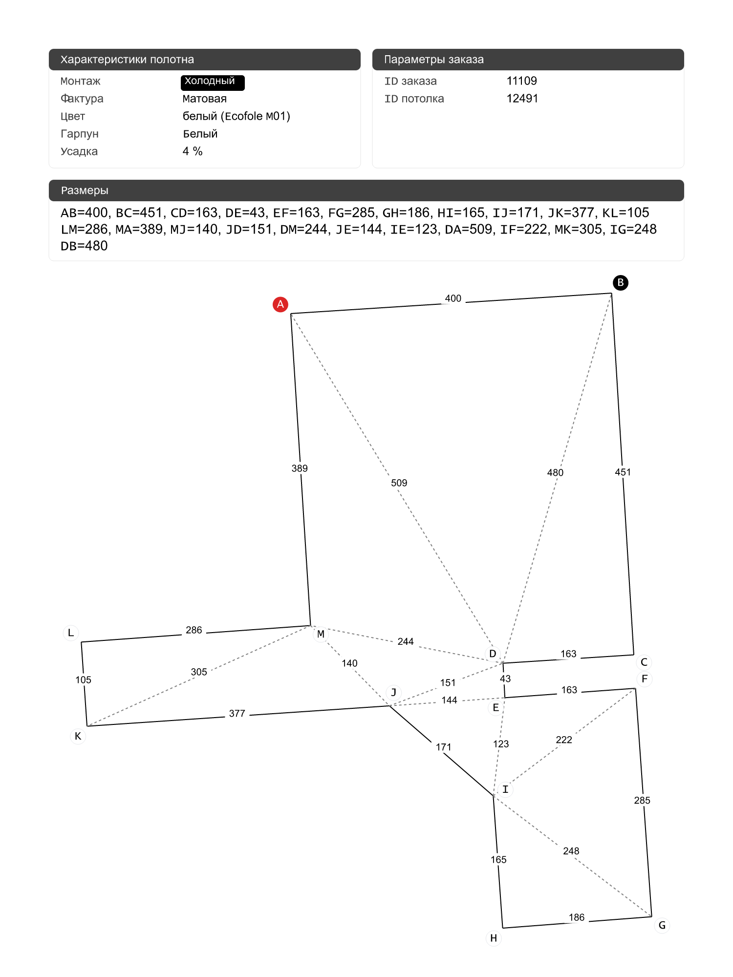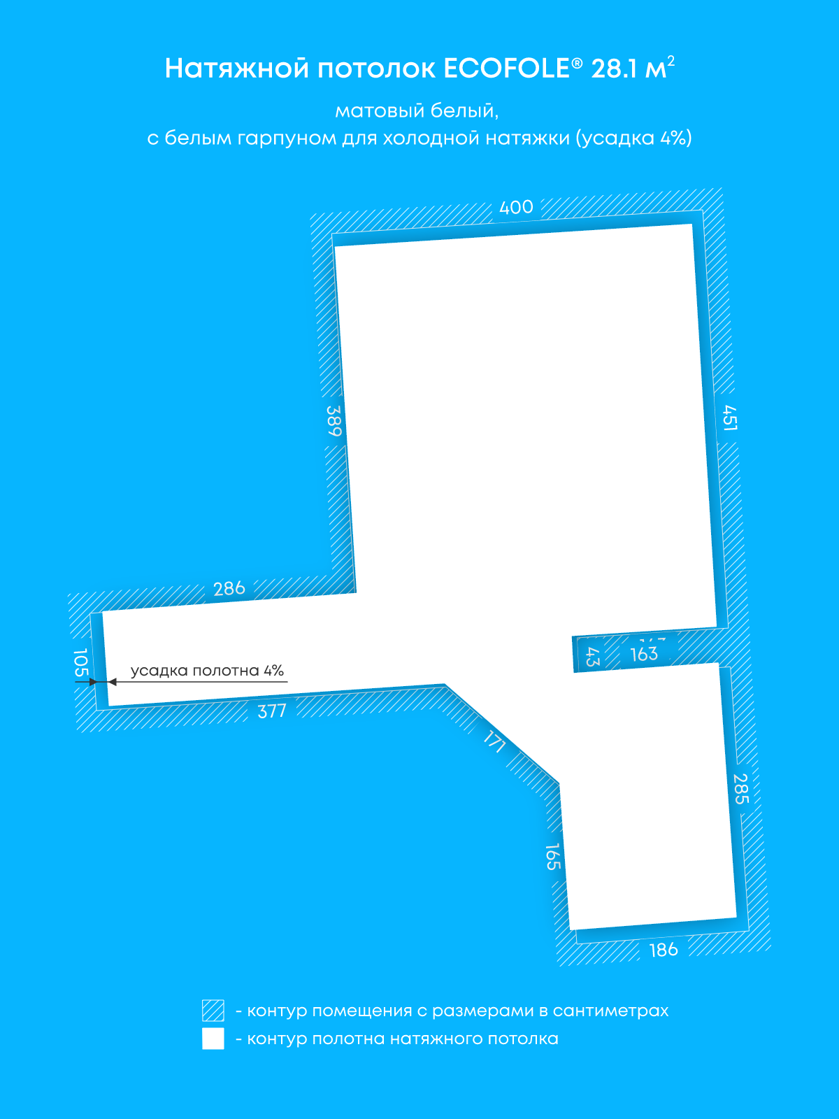 Натяжной потолок белый матовый, холодной натяжки, изготовленный по индивидуальным размерам покупателя, для помещения площадью 28.1 м2
