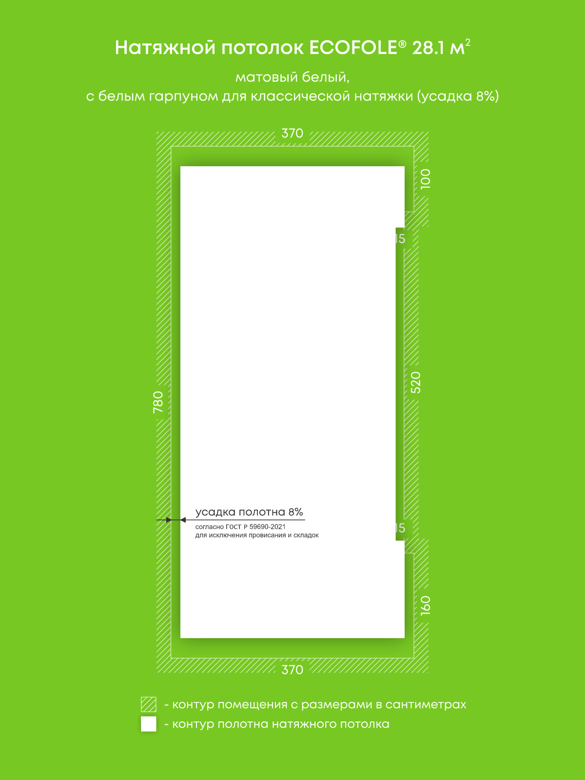 Натяжной потолок белый матовый, изготовленный по индивидуальным размерам покупателя, для кухни площадью 28.1 м2