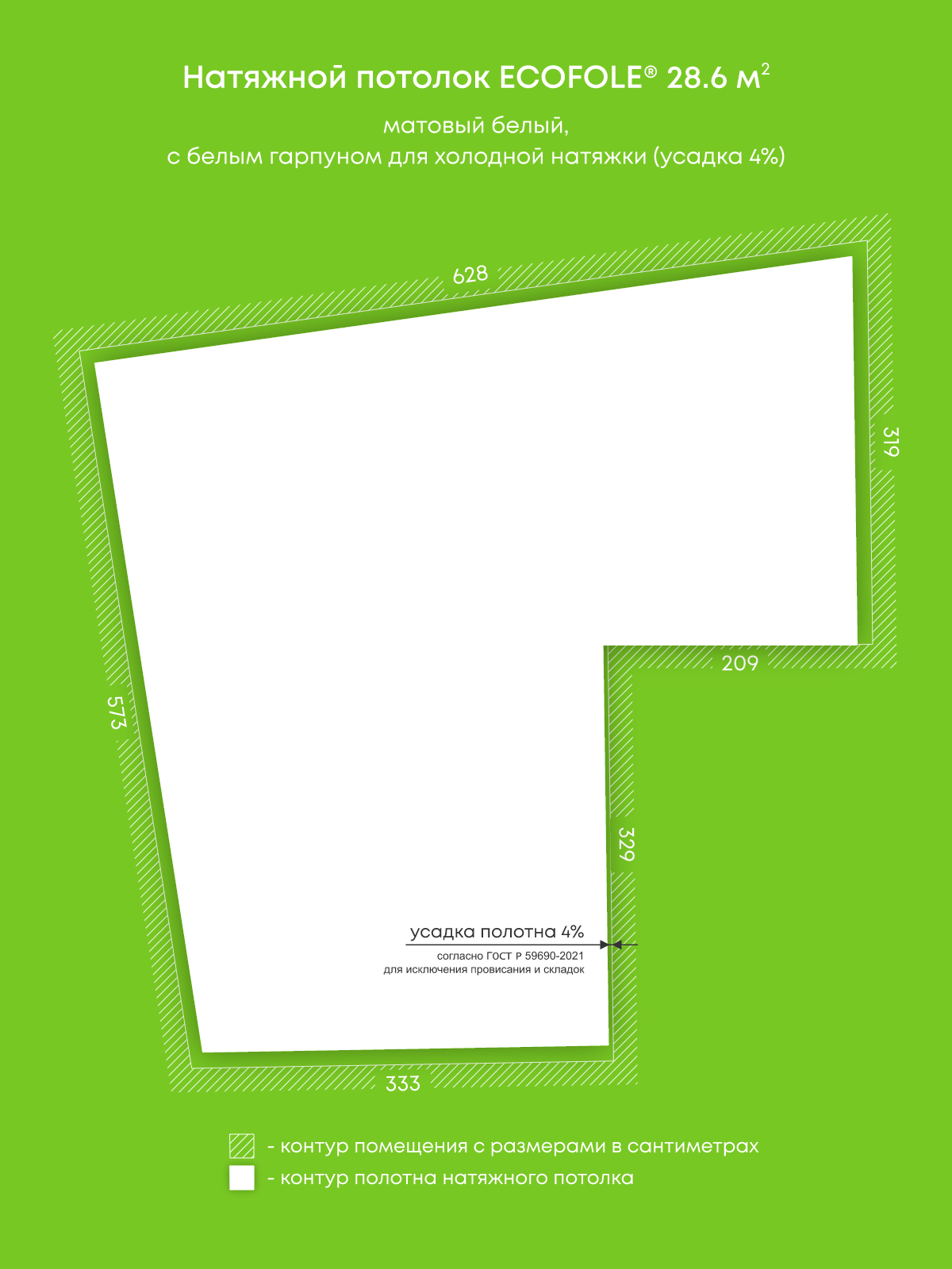 Натяжной потолок белый матовый, изготовленный по индивидуальным размерам покупателя, для комнаты площадью 28.6 м2