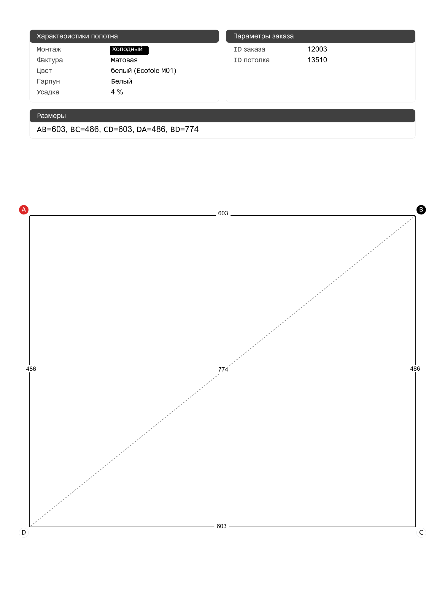 Натяжной потолок белый матовый, холодной натяжки, изготовленный по индивидуальным размерам покупателя, для помещения площадью 29.3 м2