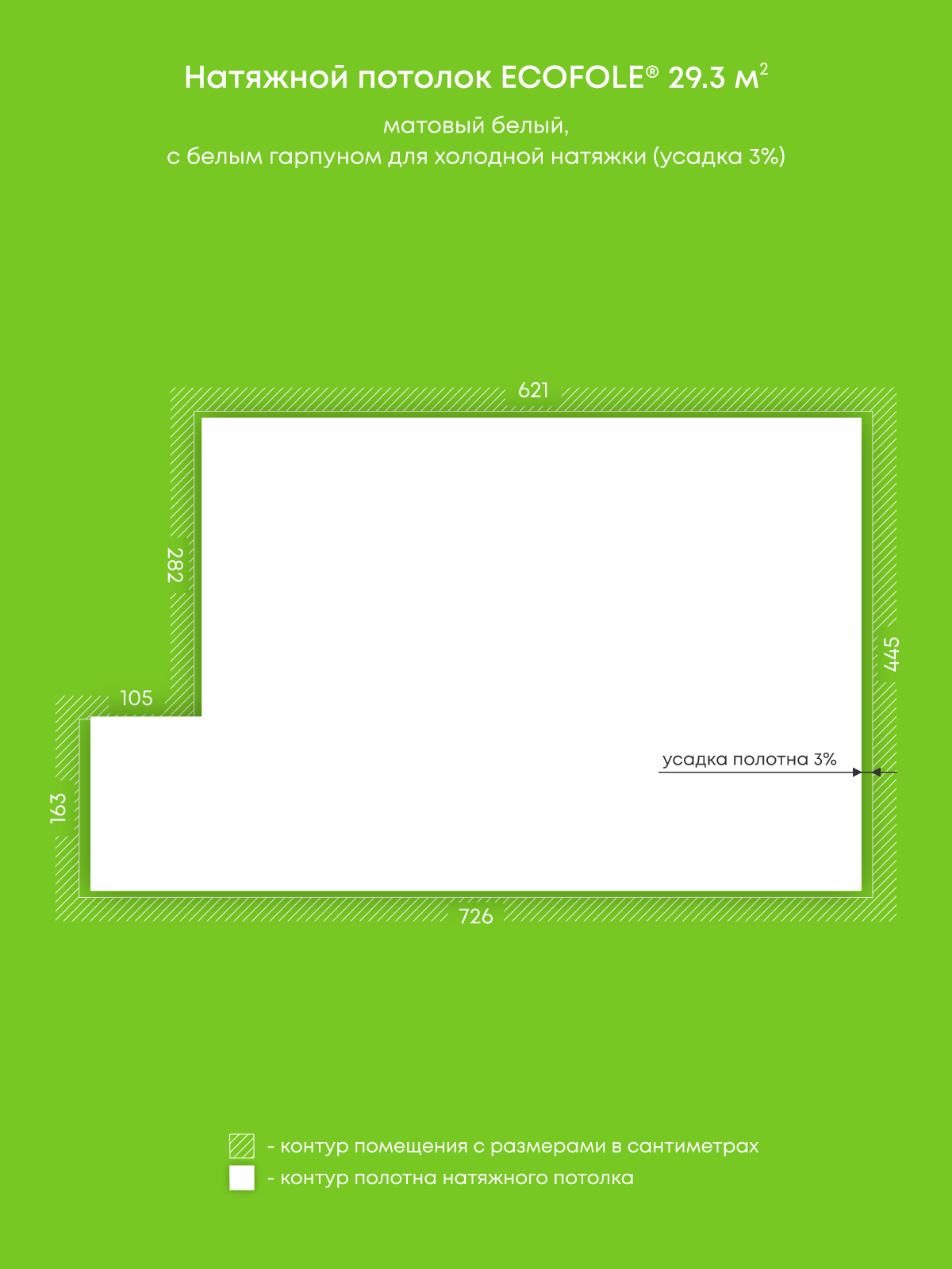 Натяжной потолок белый матовый, изготовленный по индивидуальным размерам покупателя, для кухни площадью 29.3 м2