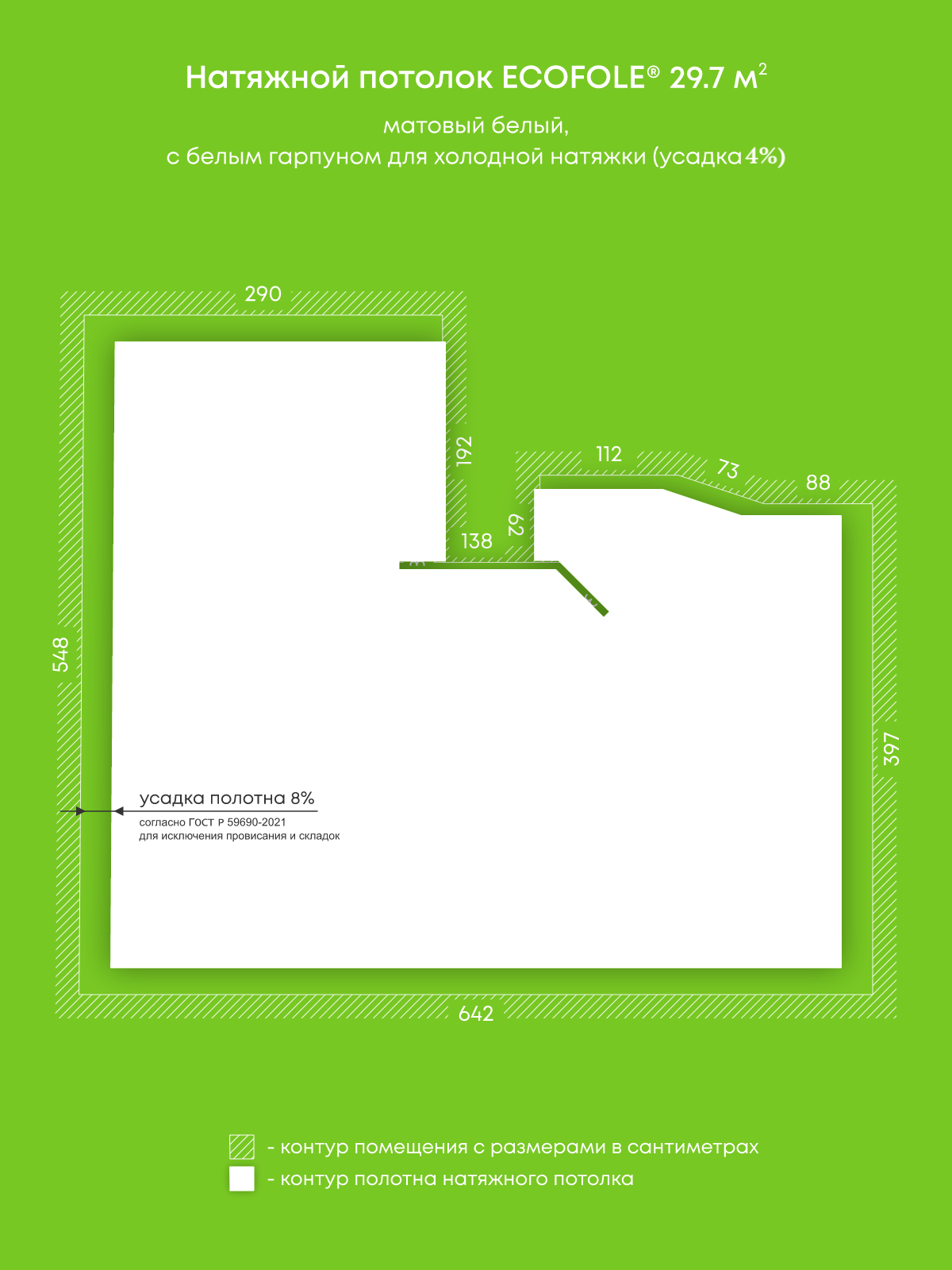 Натяжной потолок белый матовый, изготовленный по индивидуальным размерам покупателя, для помещения площадью 29.7 м2