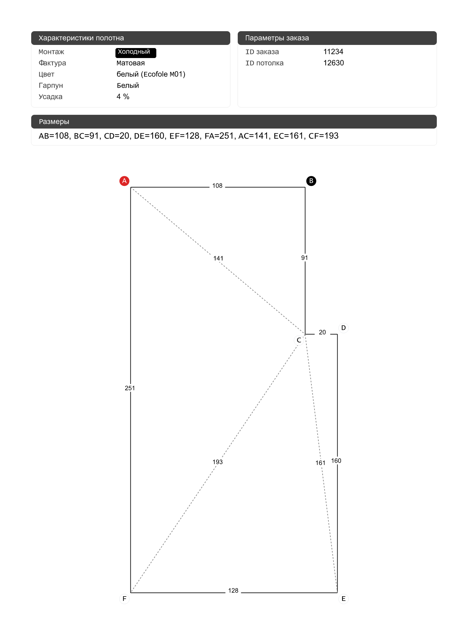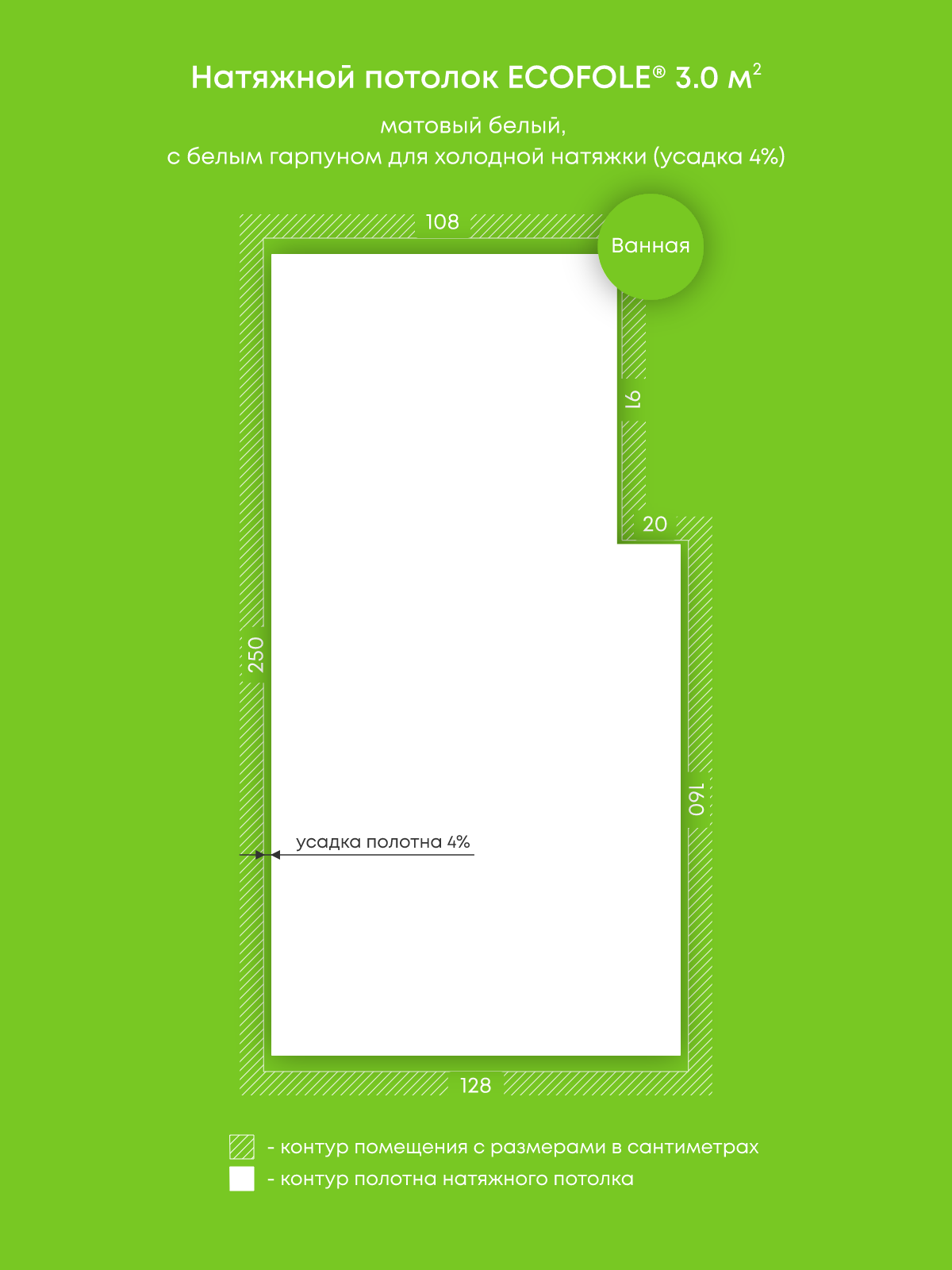Натяжной потолок белый матовый, холодной натяжки, изготовленный по индивидуальным размерам покупателя, для помещения площадью 3 м2