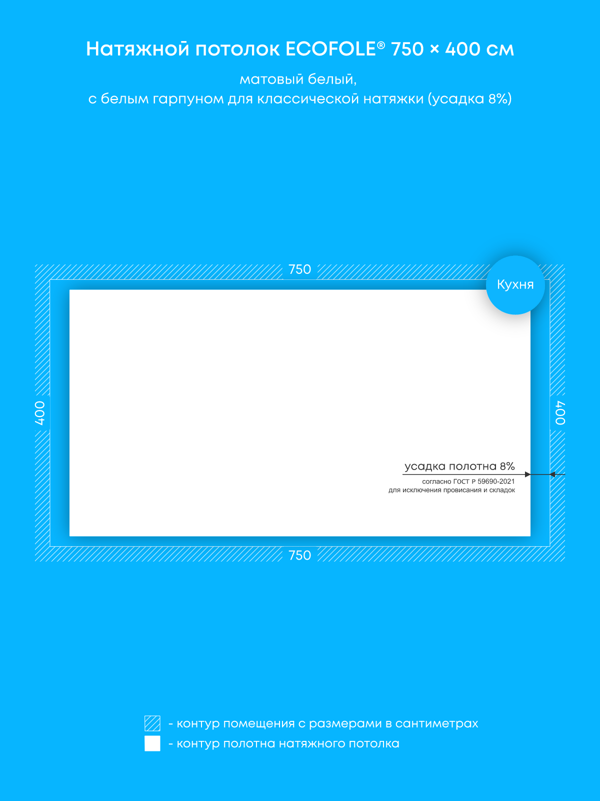 Натяжной потолок белый матовый, классической натяжки, изготовленный по индивидуальным размерам покупателя, для помещения площадью 30 м2