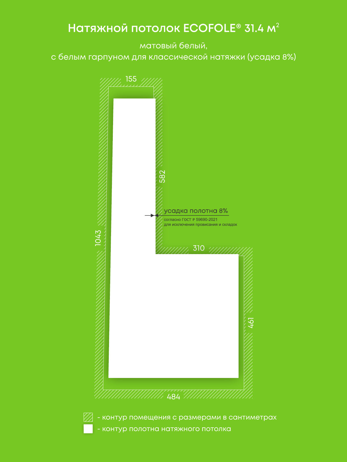 Натяжной потолок белый матовый, изготовленный по индивидуальным размерам покупателя, для кухни площадью 31.4 м2