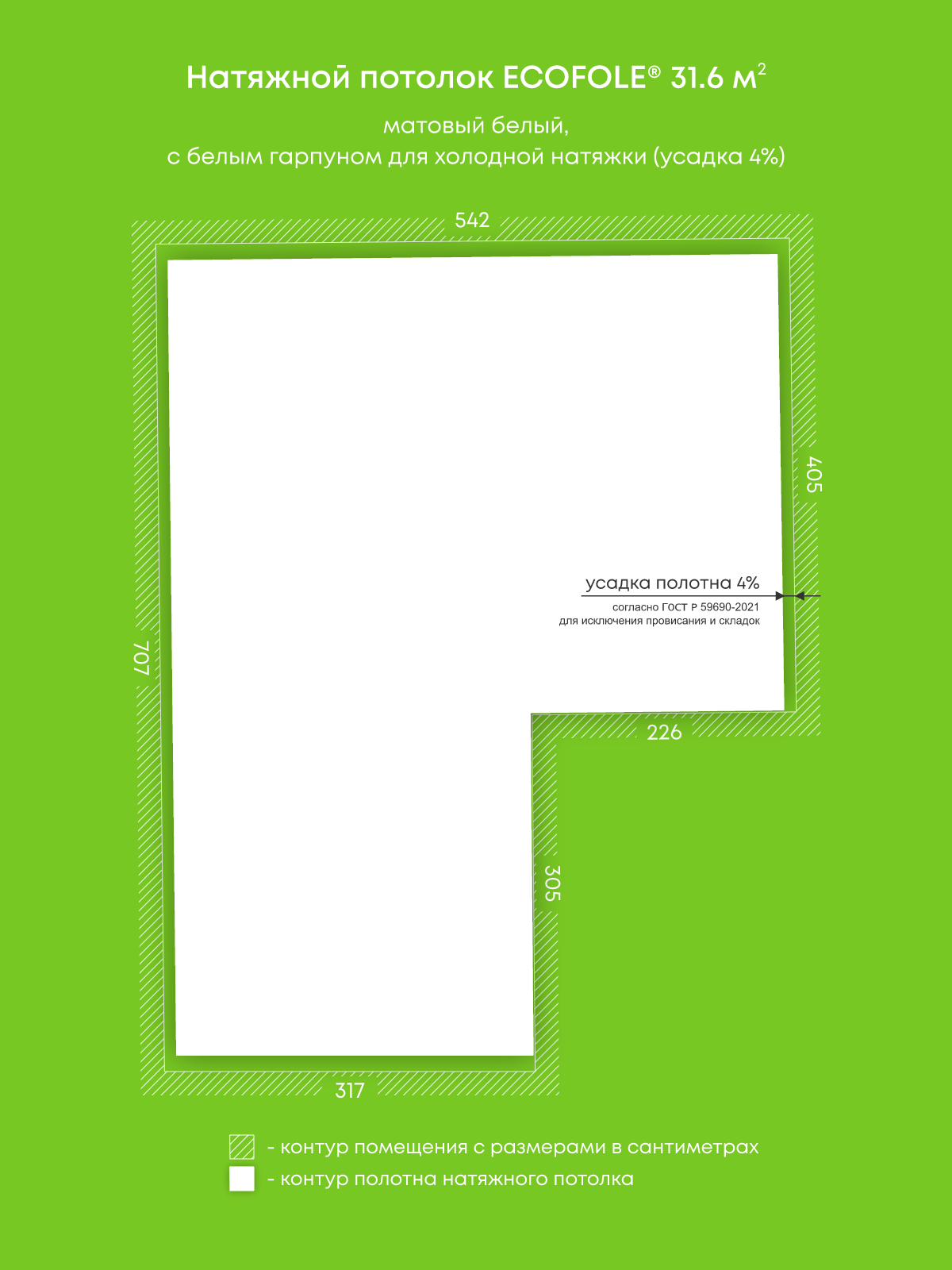 Натяжной потолок белый матовый, изготовленный по индивидуальным размерам покупателя, для помещения площадью 31.6 м2