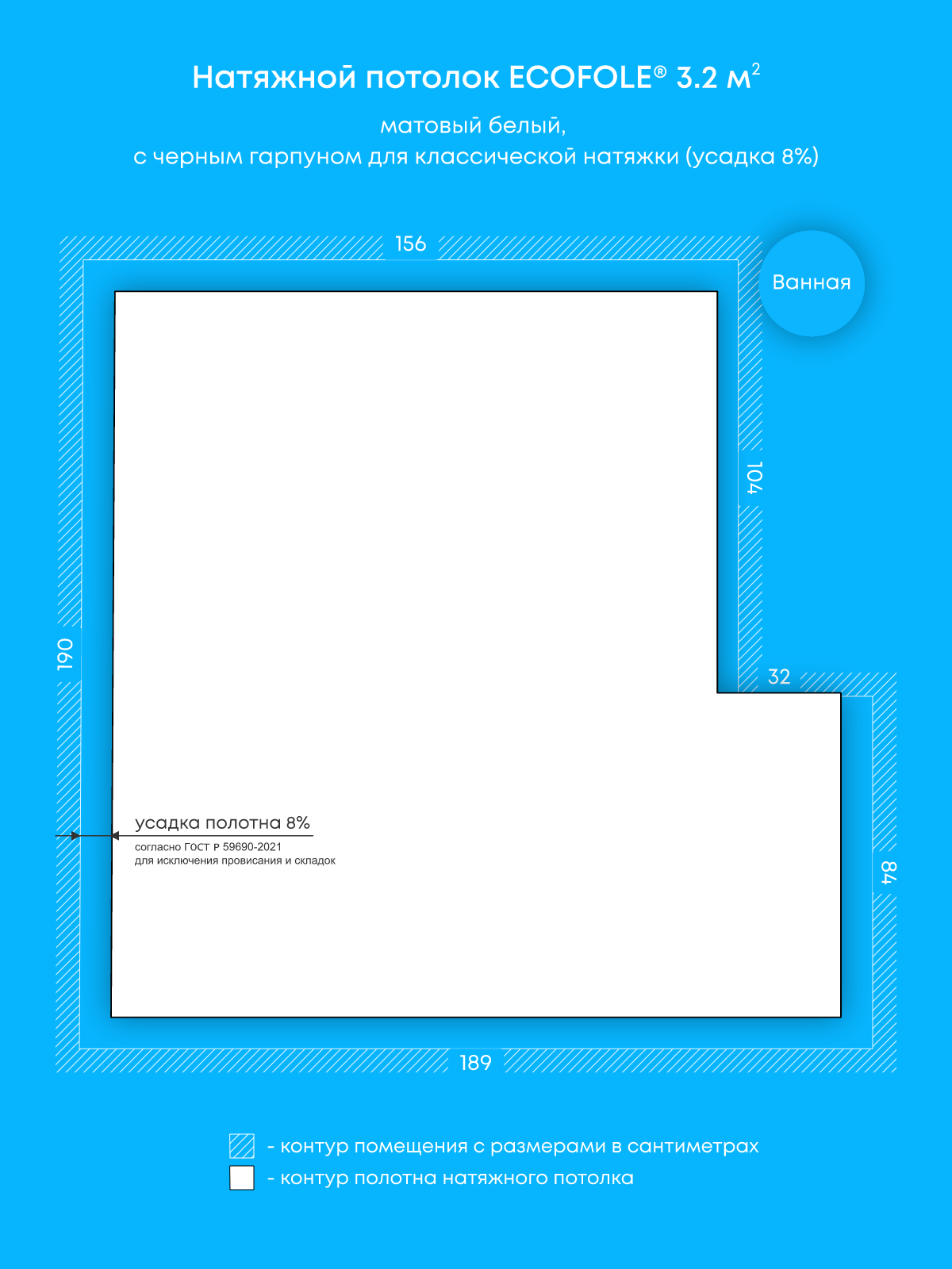 Натяжной потолок белый матовый, изготовленный по индивидуальным размерам покупателя, для ванной площадью 3.2 м2