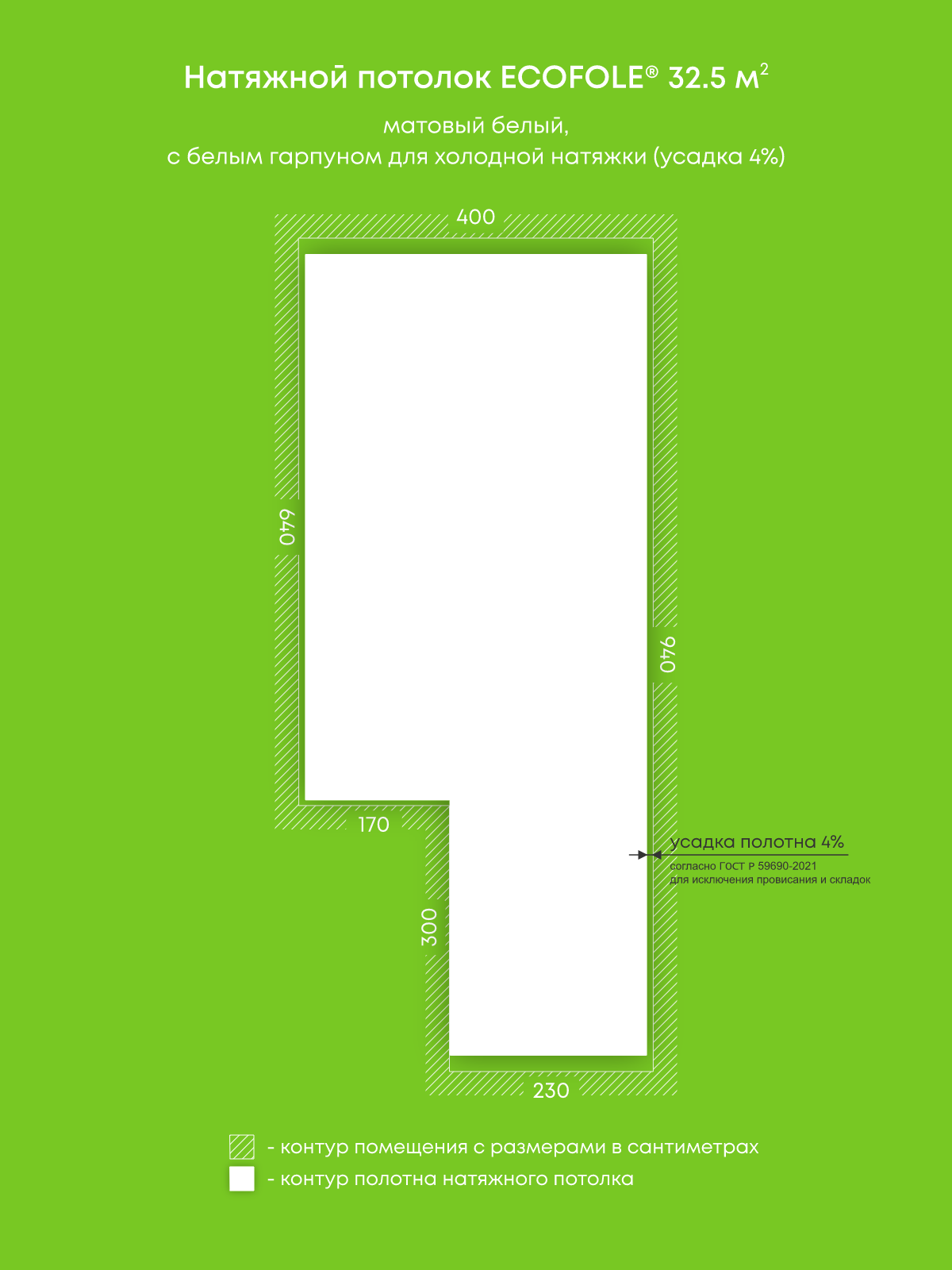 Натяжной потолок белый матовый, изготовленный по индивидуальным размерам покупателя, для гостиной площадью 32.5 м2