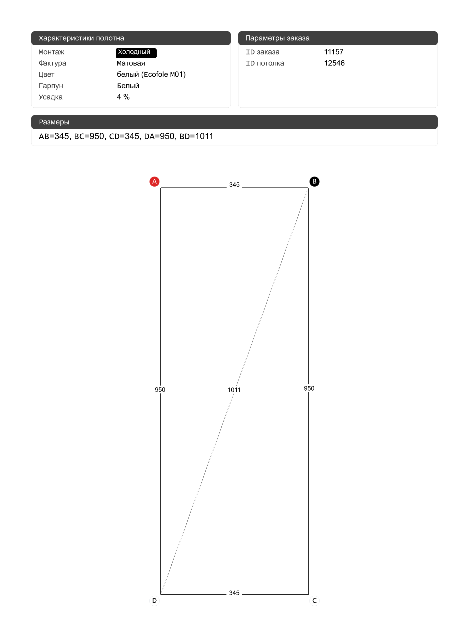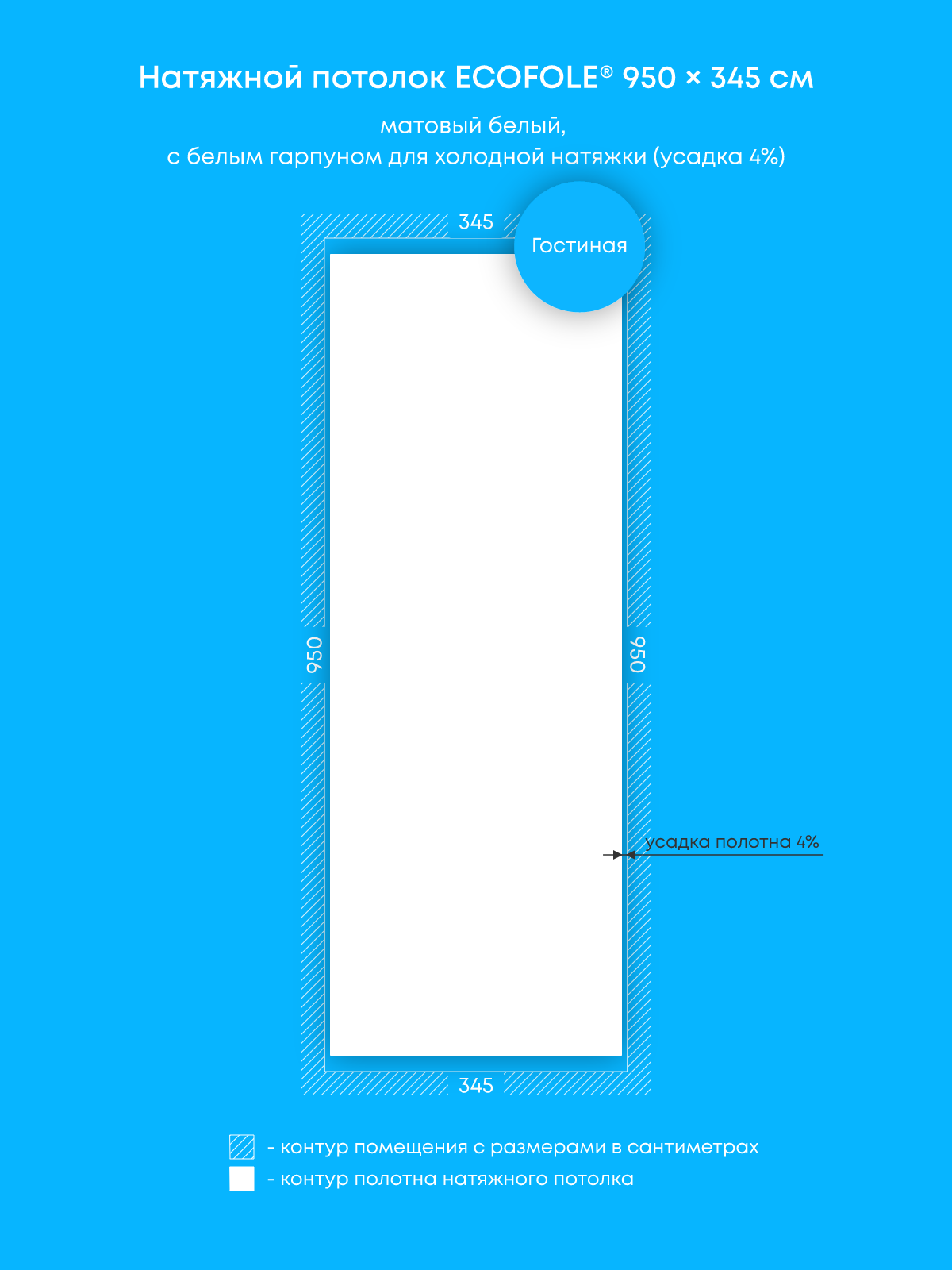 Натяжной потолок белый матовый, холодной натяжки, изготовленный по индивидуальным размерам покупателя, для помещения площадью 32.8 м2