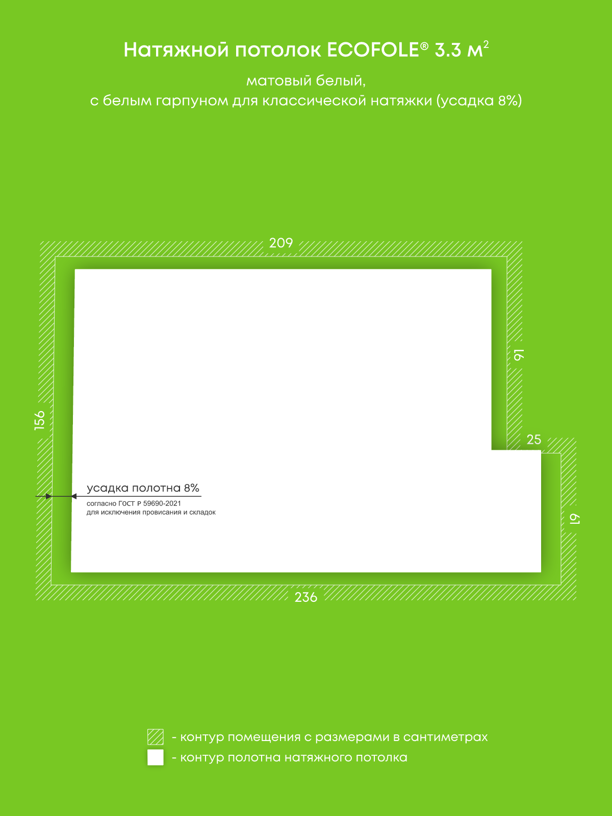 Натяжной потолок белый матовый, изготовленный по индивидуальным размерам покупателя, для комнаты площадью 3.3 м2