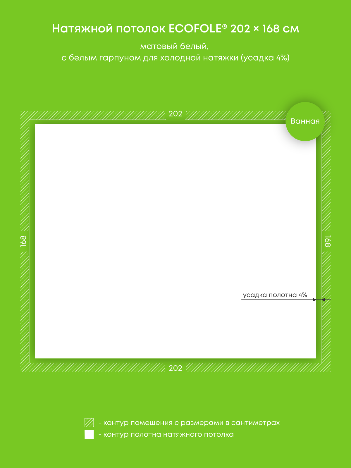 Натяжной потолок белый матовый, изготовленный по индивидуальным размерам покупателя, для ванной площадью 3.4 м2