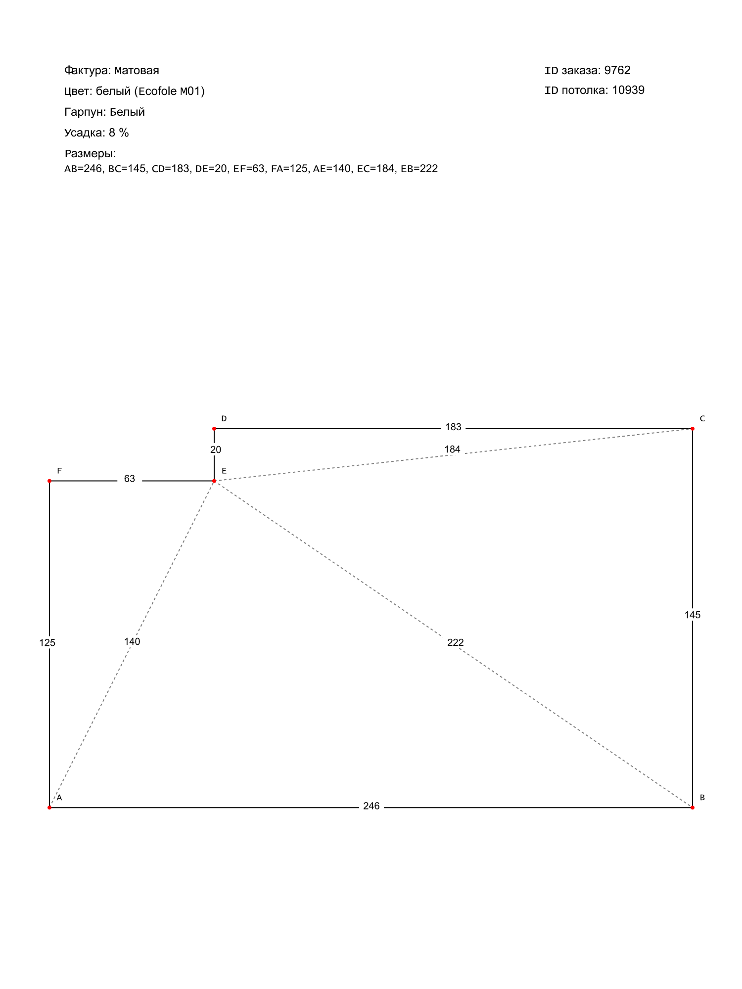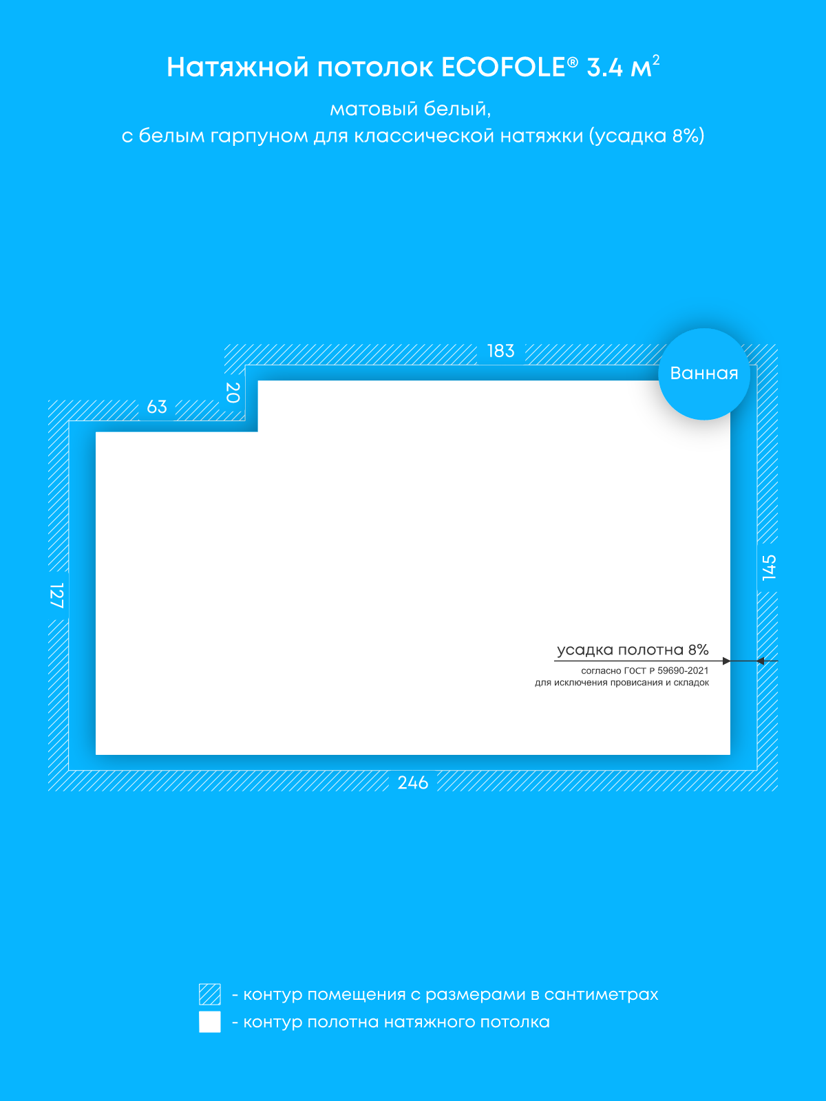 Натяжной потолок белый матовый, классической натяжки, изготовленный по индивидуальным размерам покупателя, для помещения площадью 3.4 м2