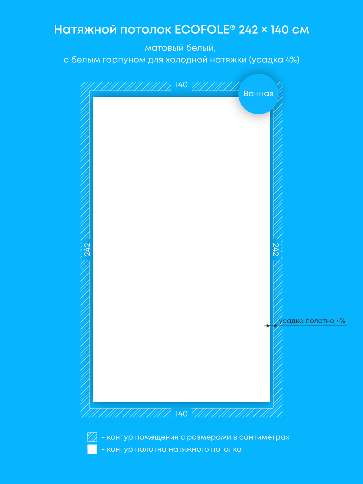 Натяжной потолок белый матовый, холодной натяжки, изготовленный по индивидуальным размерам покупателя, для помещения площадью 3.4 м2