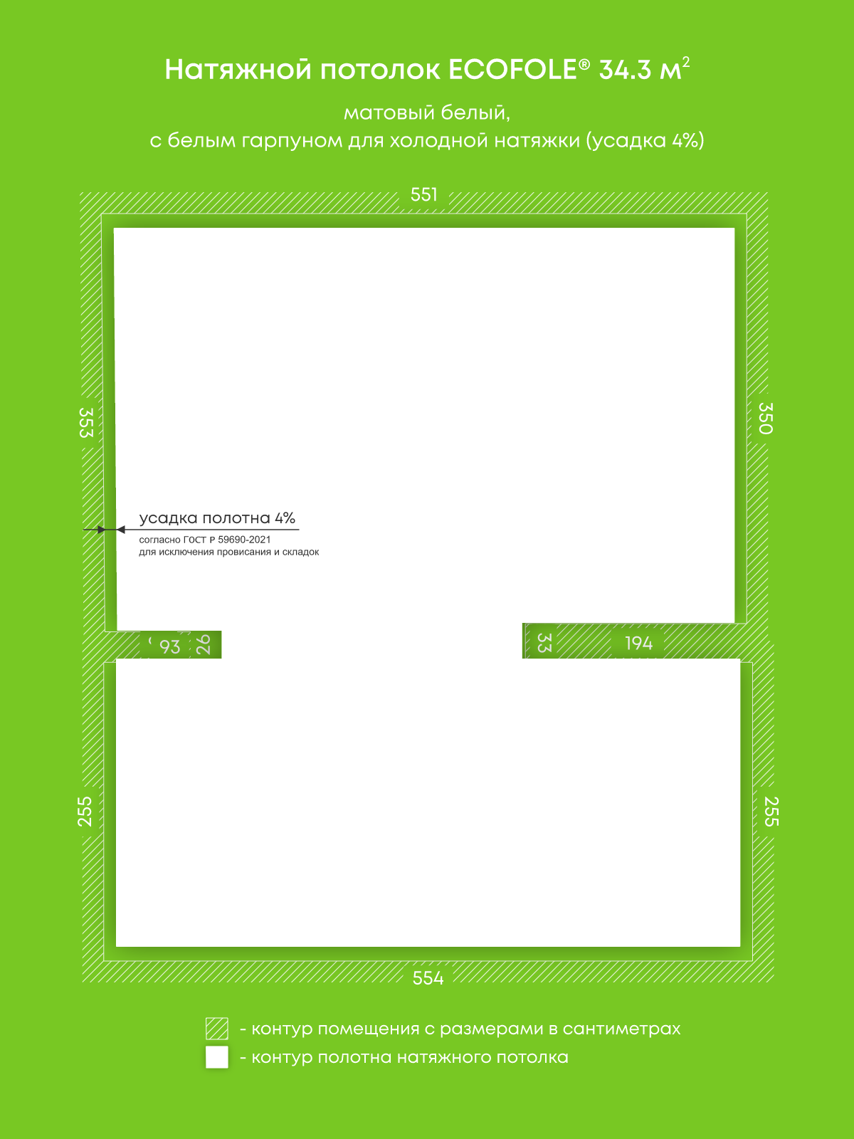 Натяжной потолок белый матовый, изготовленный по индивидуальным размерам покупателя, для кухни площадью 34.3 м2
