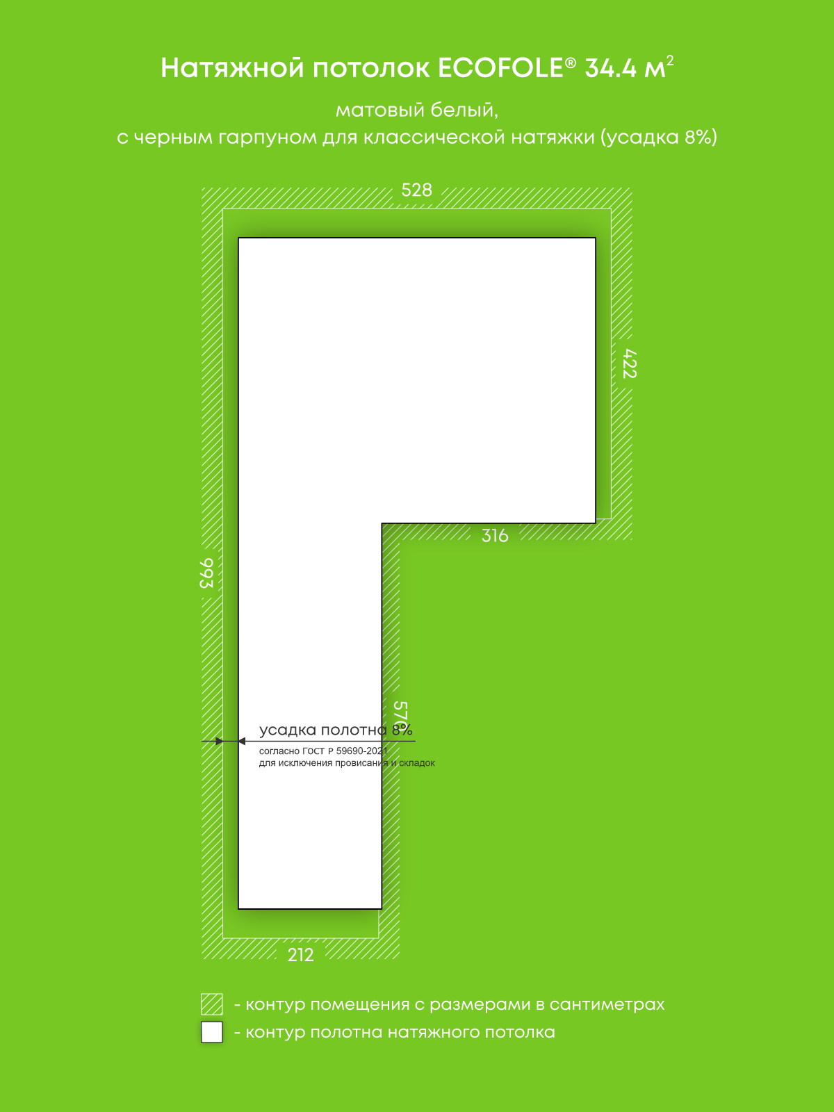 Натяжной потолок белый матовый, изготовленный по индивидуальным размерам покупателя, для кухни площадью 34.4 м2