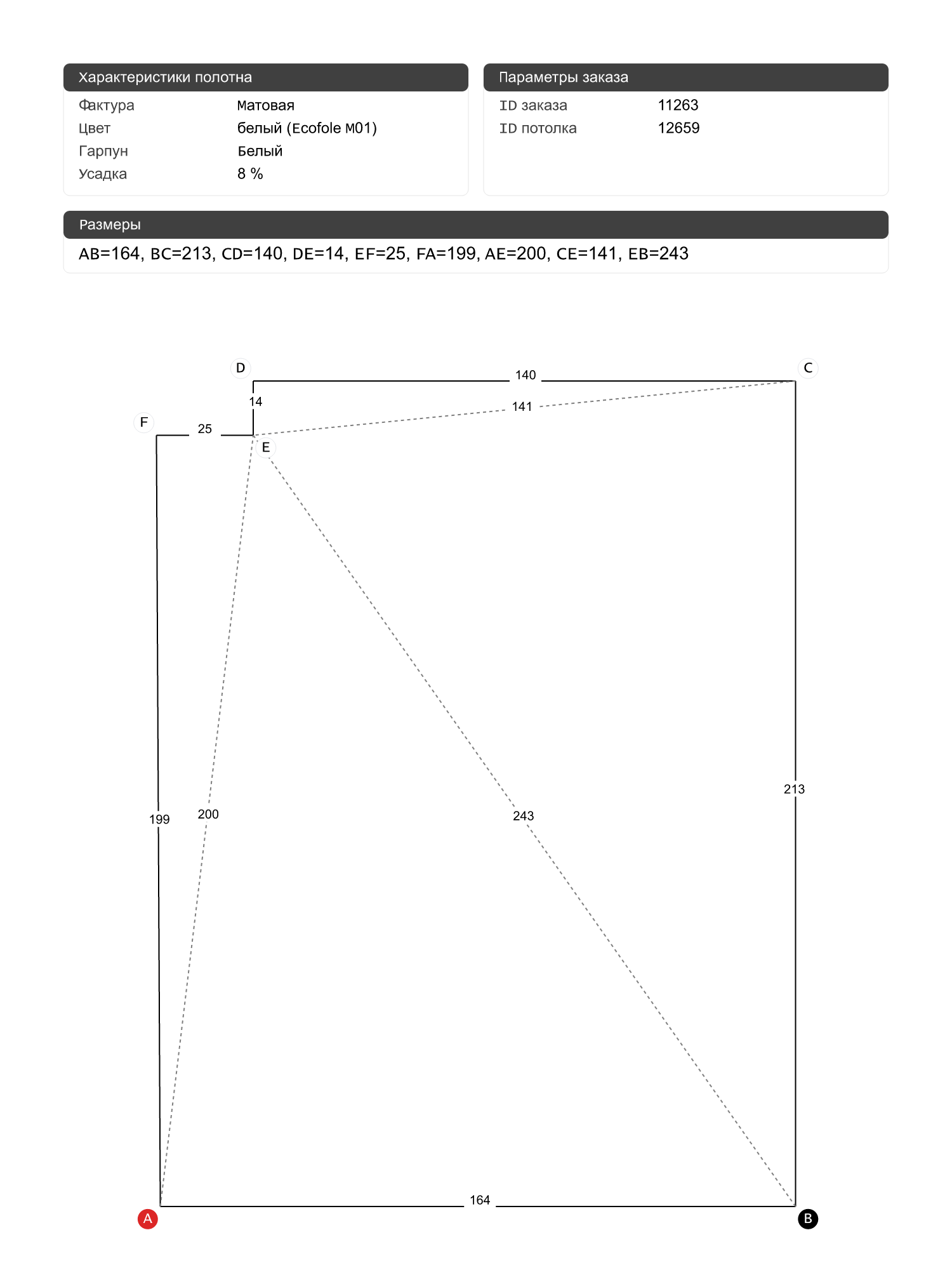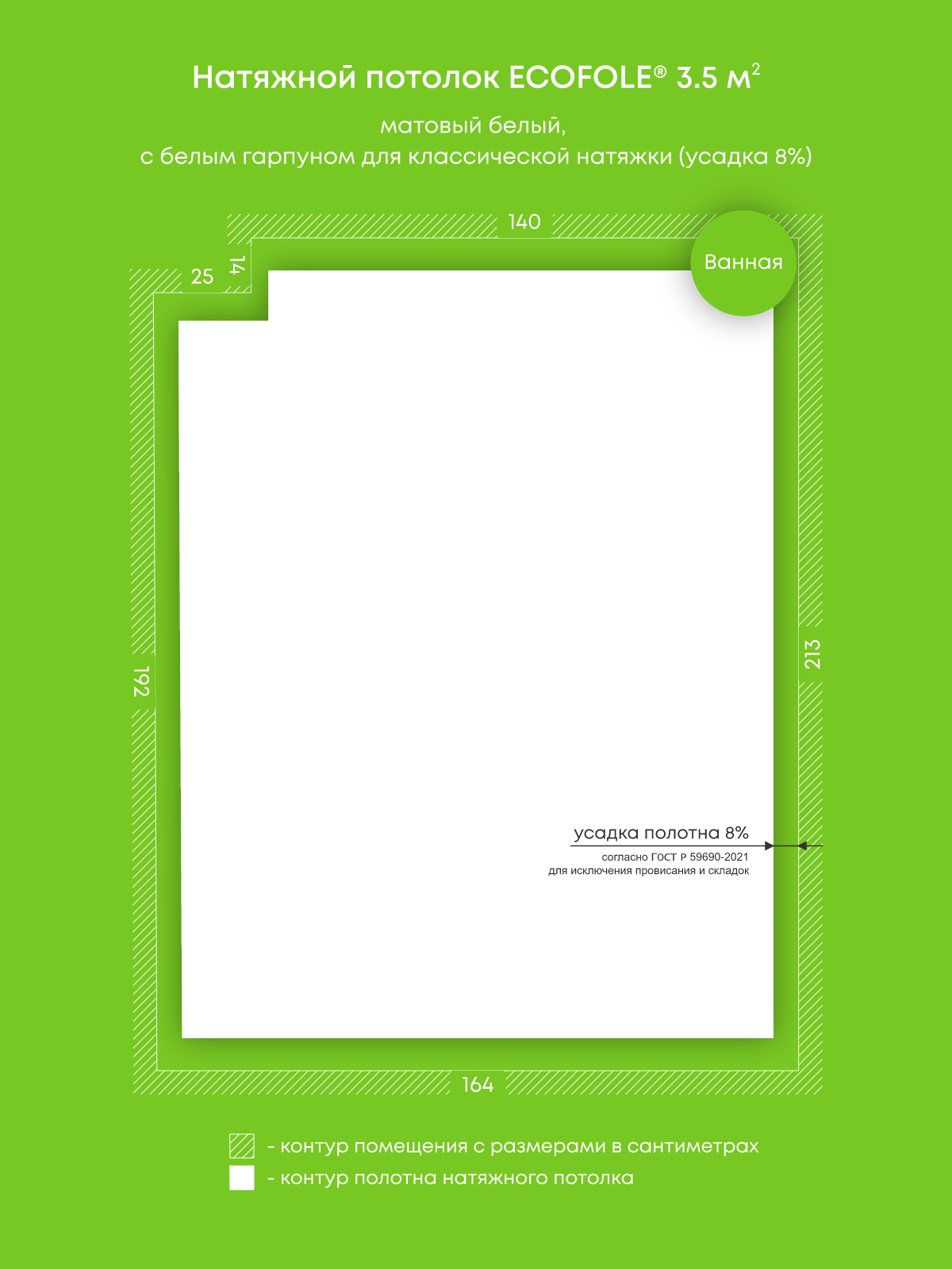 Натяжной потолок белый матовый, классической натяжки, изготовленный по индивидуальным размерам покупателя, для помещения площадью 3.5 м2