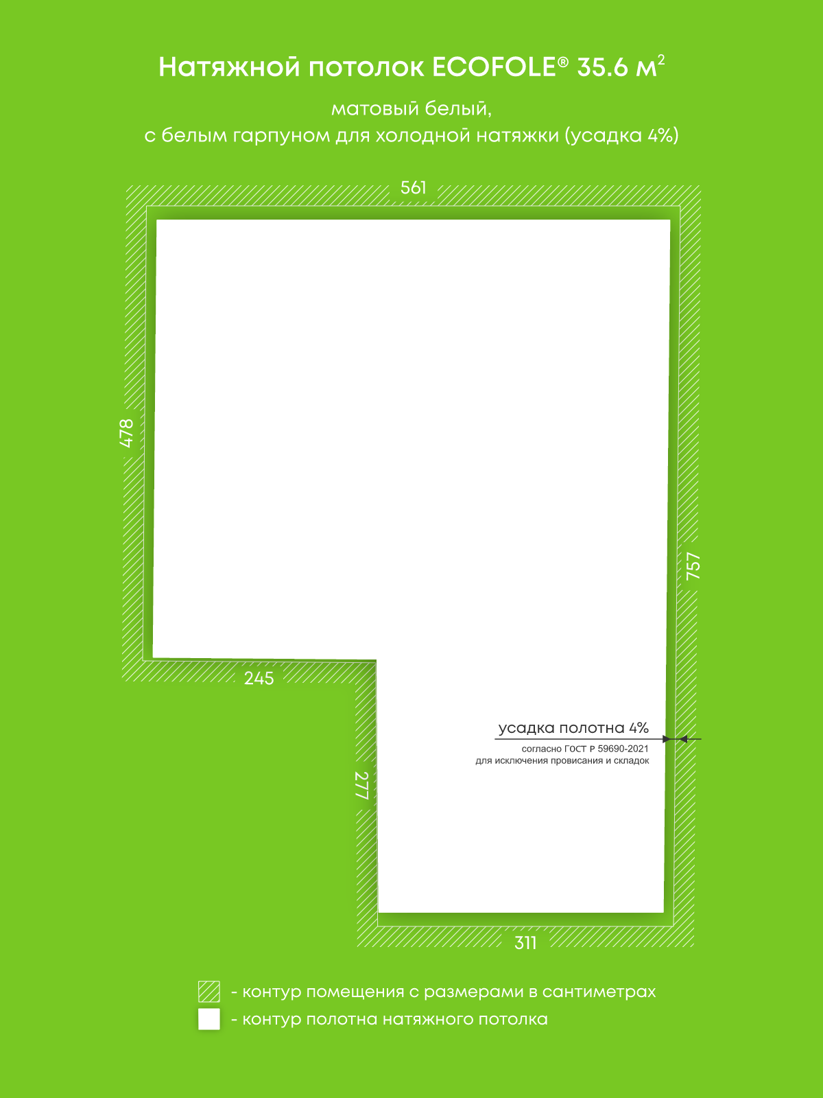 Натяжной потолок белый матовый, изготовленный по индивидуальным размерам покупателя, для комнаты площадью 35.6 м2