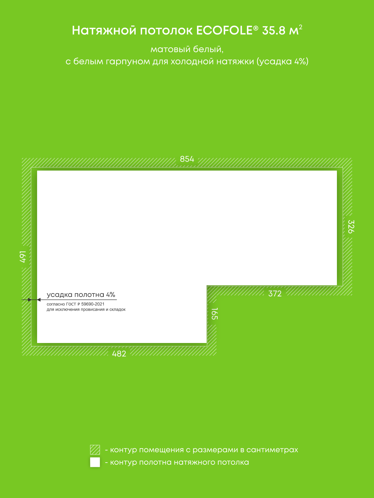 Натяжной потолок белый матовый, изготовленный по индивидуальным размерам покупателя, для гостиной площадью 35.8 м2