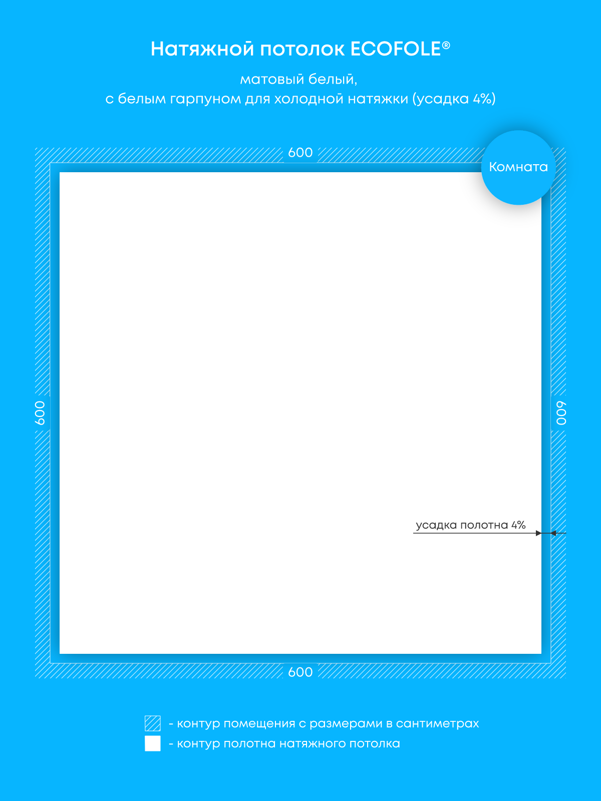 Натяжной потолок белый матовый, холодной натяжки, изготовленный по индивидуальным размерам покупателя, для помещения площадью 36 м2