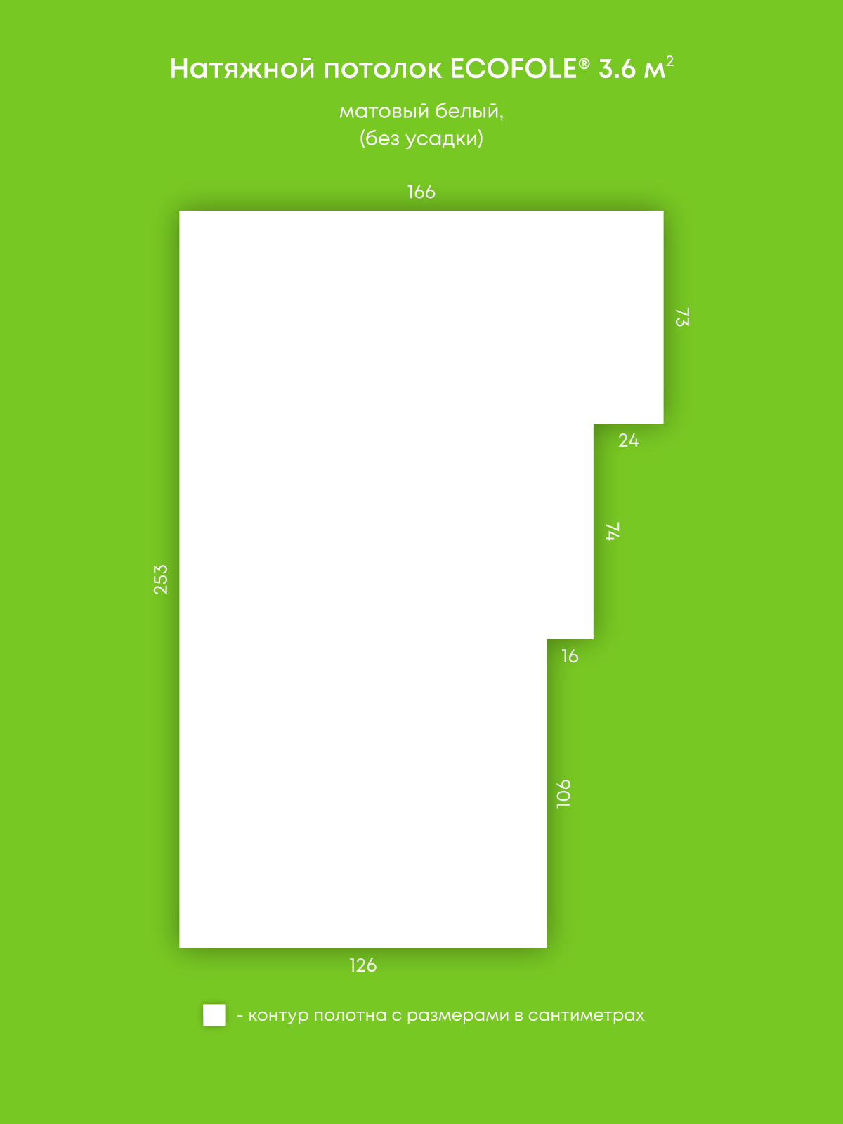 Натяжной потолок белый матовый, изготовленный по индивидуальным размерам покупателя, для помещения площадью 3.6 м2
