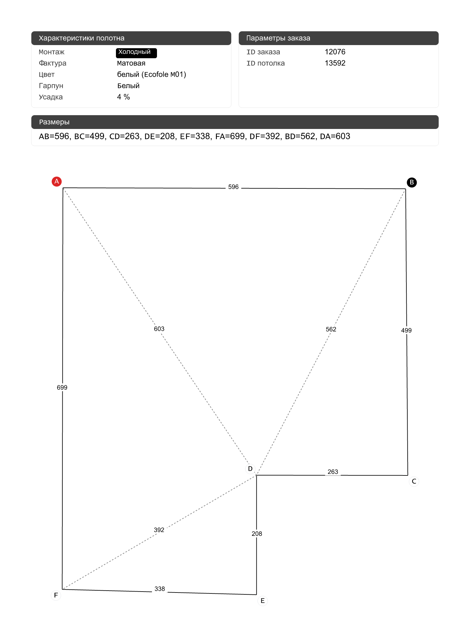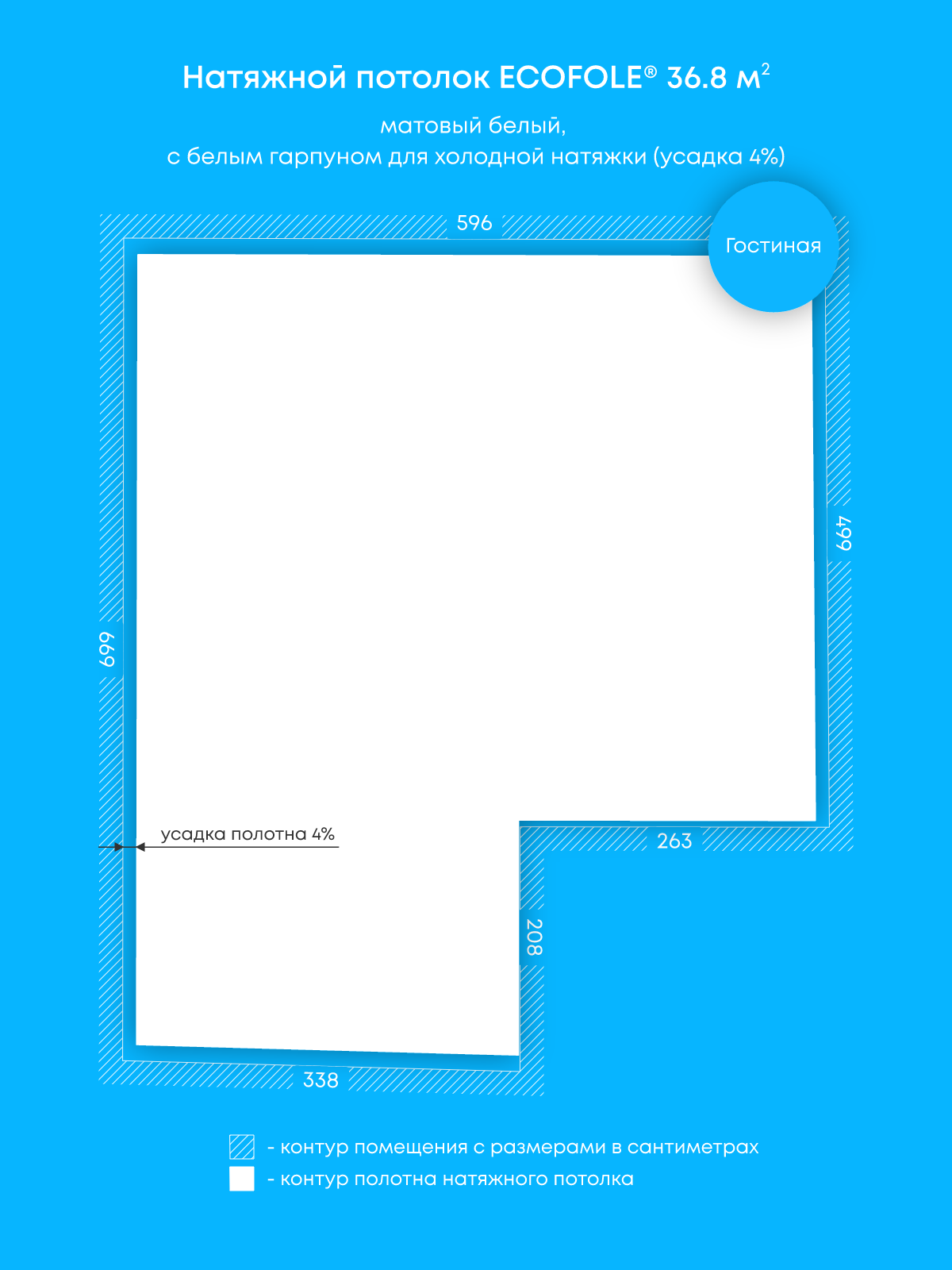 Натяжной потолок белый матовый, холодной натяжки, изготовленный по индивидуальным размерам покупателя, для помещения площадью 36.8 м2